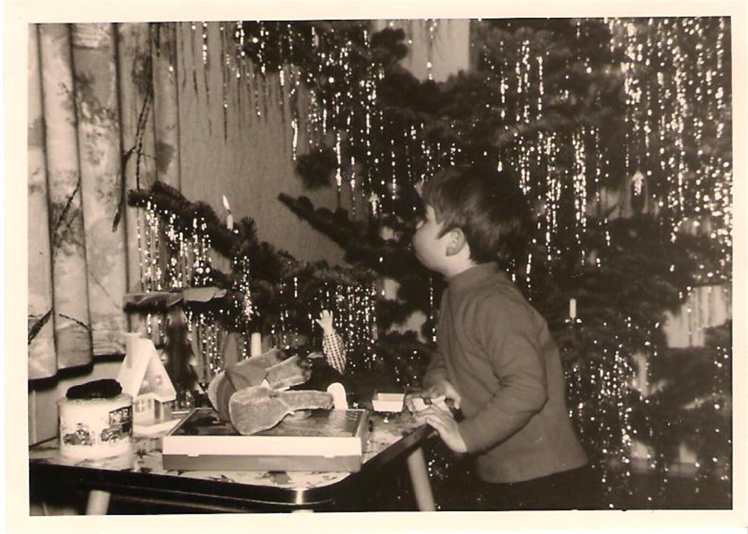 Der Baum wurde von Mutter und Oma am Nachmittag geschmückt. Ab da durfte ich mich nur noch im Kinderzimmer oder in der Küche aufhalten. Das Wohnzimmer war für mich bis nach dem Besuch der Kinderweihnacht verschlossen. Voller Spannung wartete ich anschließend auf das Läuten des Weihnachtsglöckchens. Wie festlich die Stube aussah. Der Baum strahlte im Lichterglanz. Damals hatten wir noch echte Kerzen. Das führte dazu, dass wir strikt angewiesen wurden, die Stube nie unbeaufsichtigt zu lassen. Jedes Jahr trugen die Kugeln eine andere Farbe. Mal war der Tannenbaum rot, mal weiß, mal dunkellila geschmückt. Und dazu natürlich Silber-Lametta; ich nannte die dünnen Fäden „Engelhaar“.
