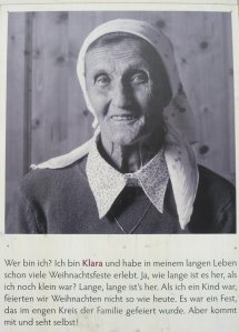 „Ich erzähle Euch nun von Weihnachten, als ich klein war: Die ganze Familie stellte sich andächtig vor dem Christbaum auf, betete, sang Weihnachtslieder und wartete ungeduldig auf die Bescherung. Die Kinder bekamen nicht so viele Geschenke wie heute, sondern begnügten sich mit einem einzigen Geschenk, manchmal bereichert mit Süßigkeiten, Obst und Nüssen. Das Geschenk war vielleicht ein Puppenhaus, ganz aus Holz, mit geschnitzten Puppenmöbeln und winzigen Vorhängen an den Fenstern. Geschenke, die das Interesse der Kinder für ihre spätere Arbeit erwecken sollten, konnten für Mädchen eine Puppenküche mit allen Küchenutensilien sein, für Buben ein Holzpferd mit Wagen oder eine Laubsäge. Aber das war schon eher ein Weihnachtsfest der „feinen Leute“. In den Bauernhäusern wurden die Geschenke nach dem Beten ausgepackt: Diese bestanden aus selbst gestrickten Strumpfhosen, Socken, Mützen oder einem Pullover.“