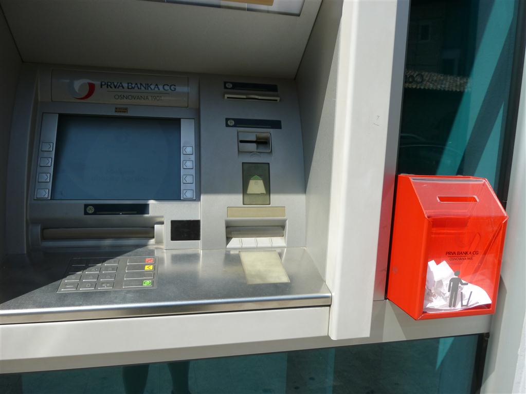 Wie praktisch! Nach der Geldausgabe steht gleich der „Papierkorb“ für die Belege bereit. Gesehen in Ulcinj/Montenegro.