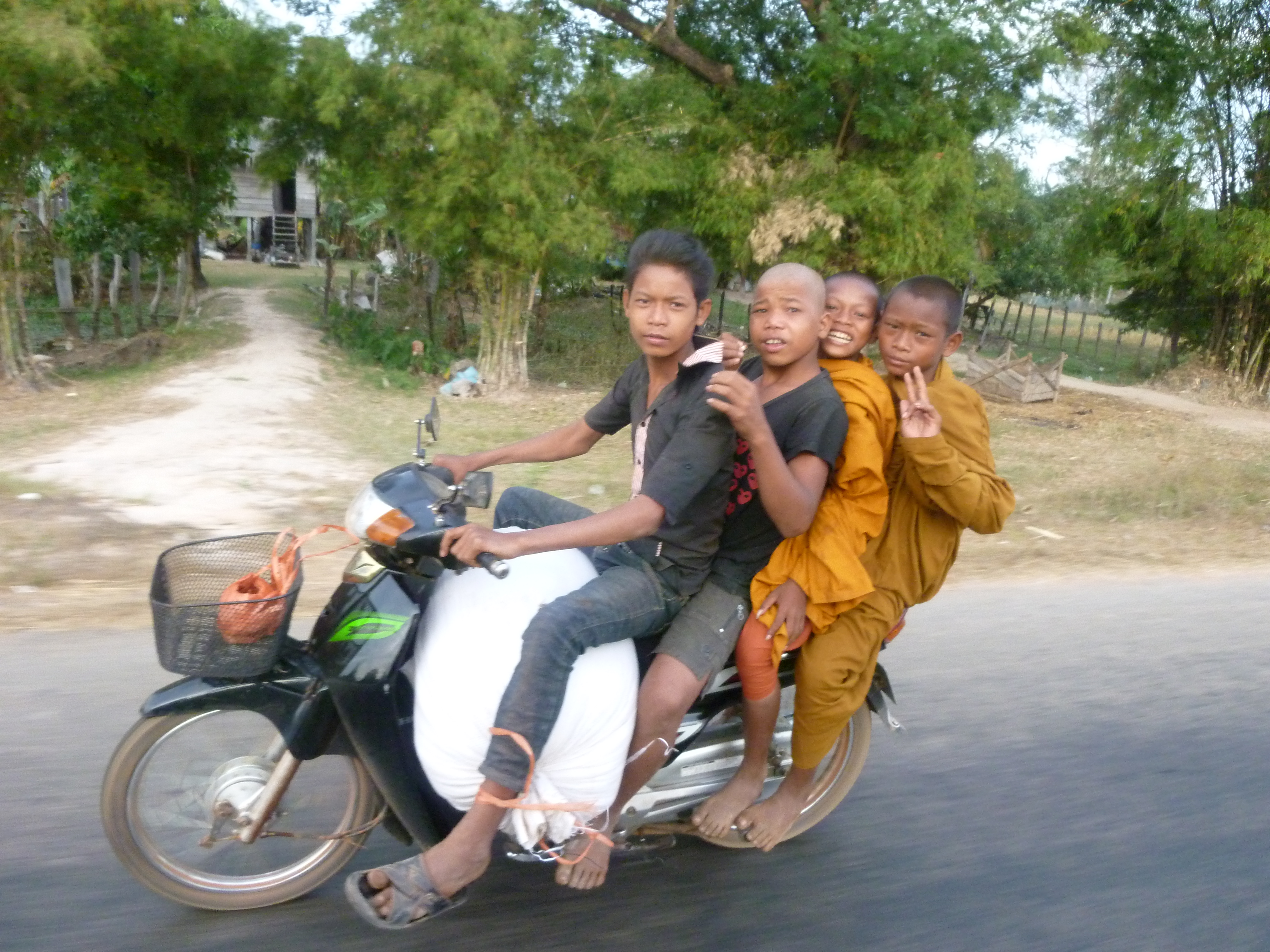 Crossing the border at Aranyaprathed into Cambodia. Long queue at the Thai border. Waiting for about one hour to pass the controls. Same at the Cambodian entry. Putting some Thai Baht into the passport helps. Corruption speaks everywhere the same language. They just waved me through, I entered the new country in a couple of minutes. I got into a shared taxi and after three hours I arrived in Siem Reap, the gateway to the stunning jungle world of Angkor Wat. People drive here at least in 3 on their motorcycles, some even with the whole family.