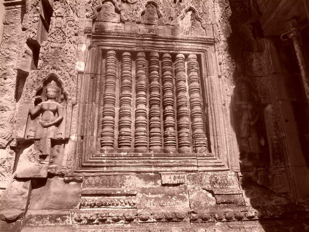 Indeed, I visited lots of temples, but I don´t want bother you with all of them. Therefore I will introduce you my 4 favorite temples, 2 of them still covered by jungle. Of course, I have to start with Angkor Wat itself, the mother of all temples. In case you know about Angkor, than you have that picture in mind: Angkor Wat replicates the universe in miniature. The central tower is Mount Meru with its surrounding smaller peaks, bounded in turn by continents and the ocean. It is surrounded by a mout, which makes the mouts around European castles like kid´s play. That temple is simply unique, a stunning blend of spirituality and symmetry, an enduring example of man´s devotion to his gods. It is famous for its beguiling Apsara, which means female temple dancers. There are more than 3.000 carved into the walls of the temple, each of them unique. Many of them were damaged during Indian efforts to clean the temples with chemicals during the 1980s, but they are now being restored by the teams of the German Apsara Conservation Project, which belonged before to the German Development Service (DED, now GIZ). This was my first encounter again with Angkor Wat. I just was sitting in a quiet corner, avoiding the hordes of tourists and remembering the quiet days I had long time ago …