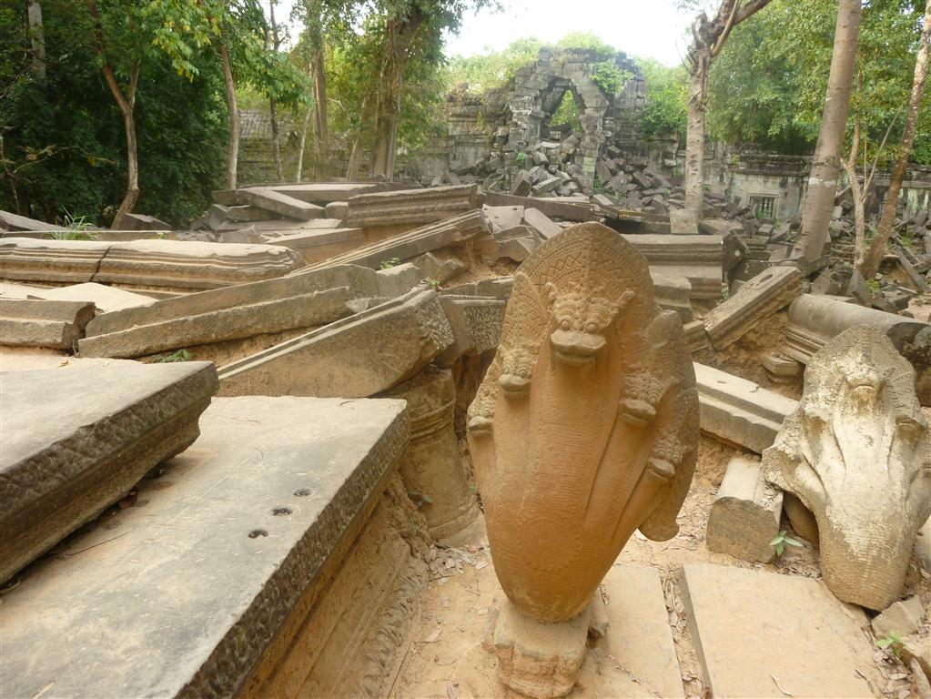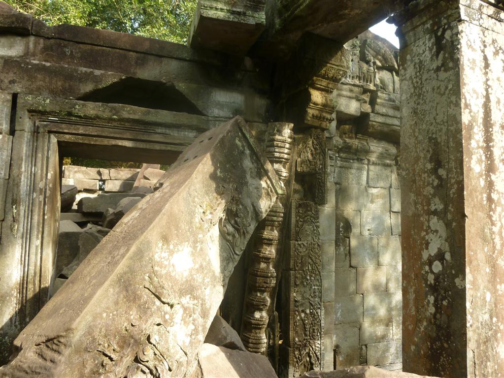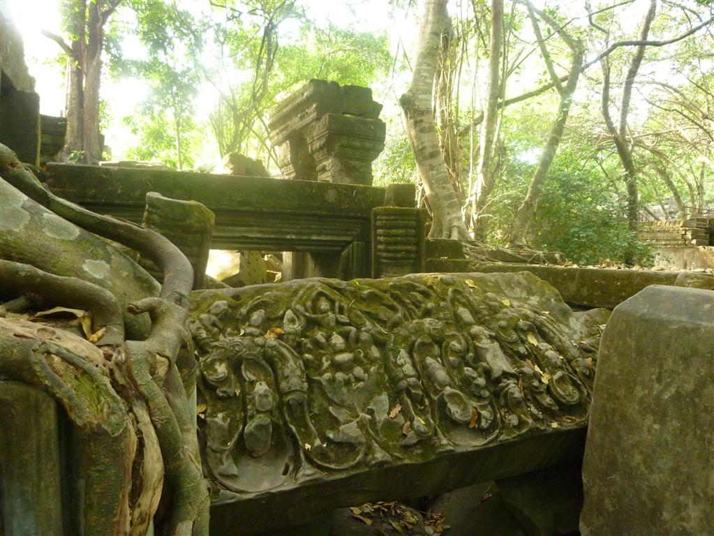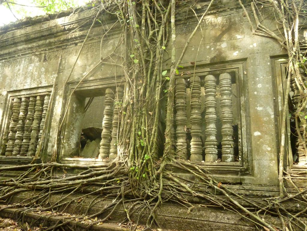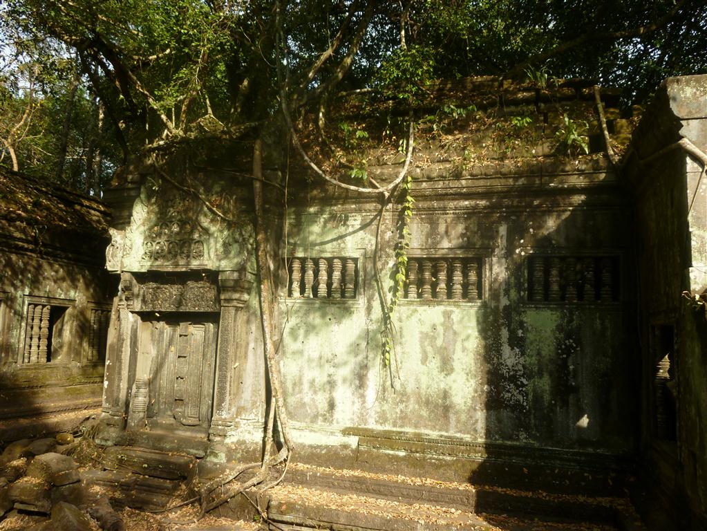 The third day I spent completely at Beng Mealea. TukTuk-Driver Na just drove me there in a two hour trip one way, each way about 80 Kilometers. Indeed, Beng Mealea is one of the most mysterious temples at Angkor and it is something like the ultimate Indiana Jones experience. Build in the 12th century the temple has been utterly subsumed by jungle. A young guide there showed me the hidden secrets, climbed with me over piles of masonry, through long dark chambers and between hanging vines. She showed me hidden impressive carvings as well as a well preserved library. The movie of Jean-Jacques Annaud´s “Two Brothers” has been made here.