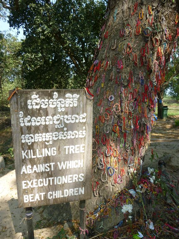 Next we drove to the Killing Fields of Choeung Ek outside the capital. Between 1975 and 1978 about 17.000 men, women, children and infants who had been detained and tortured at S 21 were transported to the extermination camp of Choeung Ek. They were often bludgeoned to death to avoid wasting precious bullets. The remains of almost 9.000 people, many of whom were bound and blindfolded, were exhumed in the year 1980 from mass graves: 43 of the 129 communal graves here have been left untouched.
