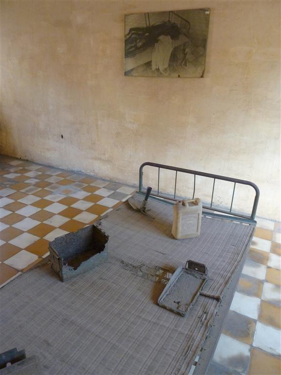 In 1977-1978 Building A was converted into a set of rooms, the window were panelled with glass to minimize the sound of prisoner´s screams heard outside the facility in times of torture. That building was used for detaining cadres who were accused of leading the uprising against Pol Pot. Their cages were furnished with a bed, blanket, cushion and mat. An iron bucket or a plastic water-container was provided to dispose their body waste. Buildings B, C and D have been reconstructed differently: The ground floor was divided into small cell by brick walls, the first floor and upper floors were used for large cells where many prisoners were crowded together.