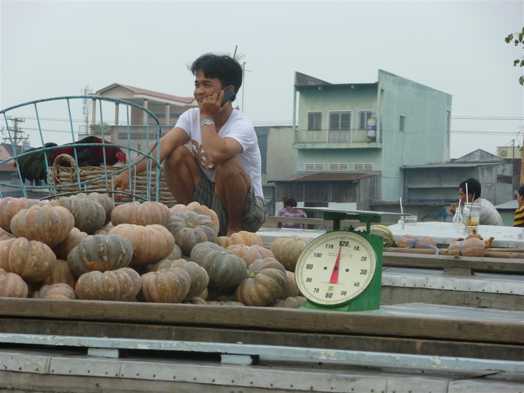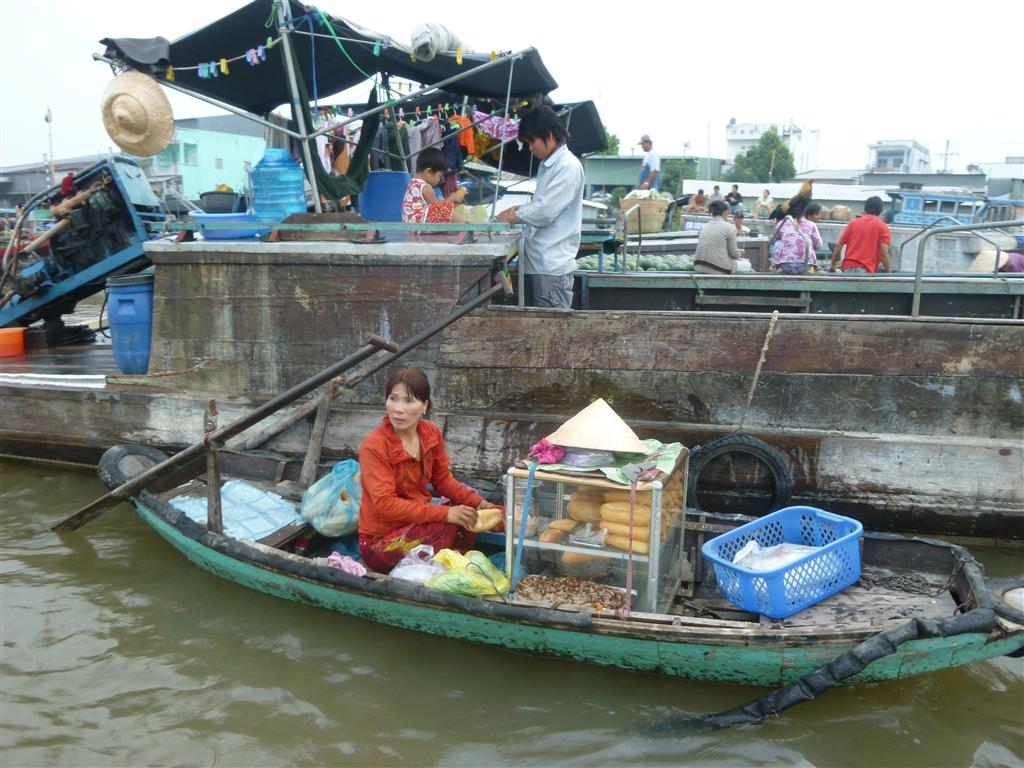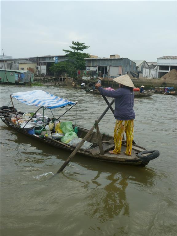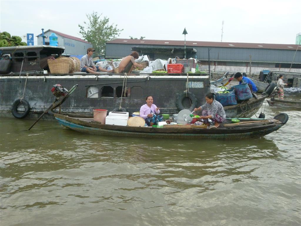 Most of the time I stayed at the river front which was not as stressful as downtown. For dinner I tried the red Dalat wine – delicious. The next morning I got off at 5 am, walking down to the waterfront. Here I met a woman on a paddle boat with motor. She was driving me to the floating market at Cai Rang. Despite of she was old and very slim she managed it well.