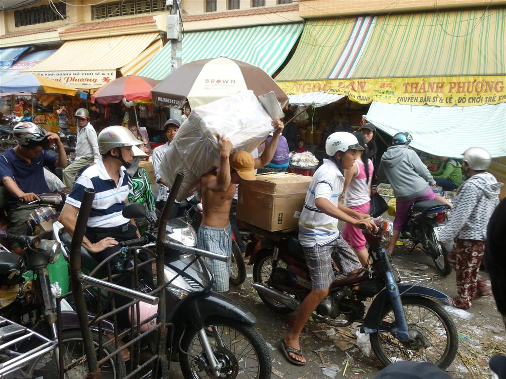 Continuing with a motorbike to the Chinese quarter of Cholon, in former times the biggest Chinese city of French-Indochina. I walked around, visiting two temples and the big market with so many people, so many goods. I lost the orientation and was glad to be outside again after a long while.