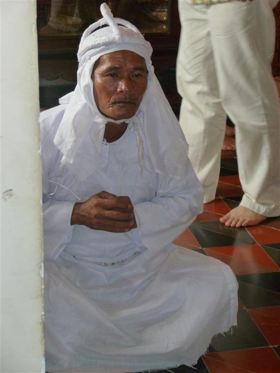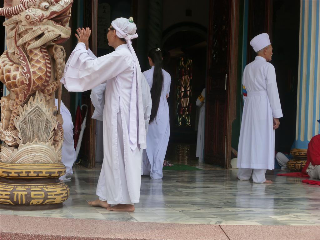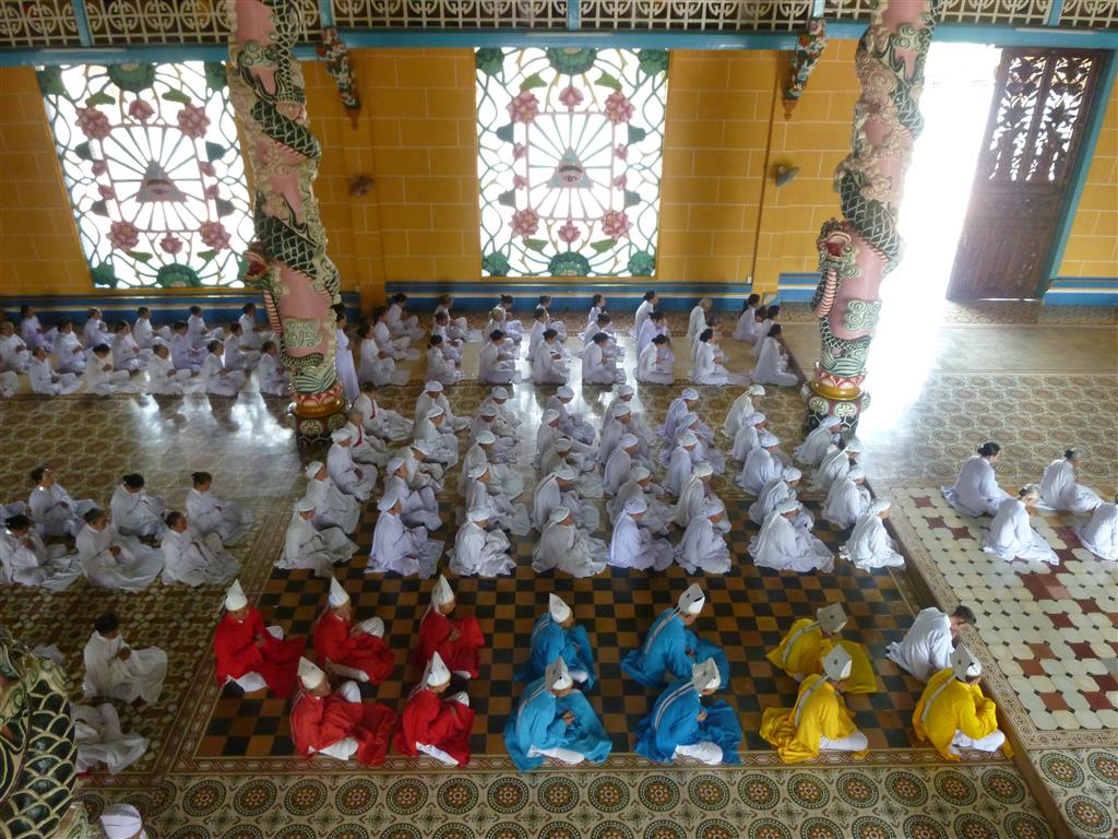 Closest to the Divine Eye above the altar, several priests in bright red, yellow and blue robes adorned with a large eye and with elaborate headdresses led the worship. On the balconies above, foreign and Vietnamese tourists watched in silence. Thirty minutes after the chanting had begun, it was over, and with that the worshipers stood up and quietly filed out. The priests and student priests remained, enjoying the cool temple air rather than braving the outdoor heat; some went to their rooms to rest.