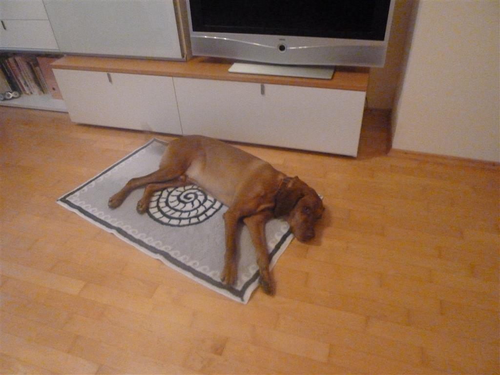 In der Tat, die Wohnung war blitzblank, kein Staubwölkchen und das Parkett sah wie aus dem Ei gepellt aus. Au weia! Frauchen blickte mich verzweifelt an. Ich lief auf den Ballen durch die Wohnung, ganz leise. Frauchens Nicken sagte mir : „Gaston, bloß nicht trippeln, keine Krallen ausfahren und möglichst gaaaanz ruhig bleiben.“ Na gut, so ganz konnte ich es nicht! Zu aufregend waren die neuen Gerüche und dann der Duft des Abendessens. Wuff! Gastgeberin Maike streichelte mich und meinte, ich sei ein so wohlerzogenes Tier. Na, wenn die mal wüsste! Gastgeber Johannes ergänzte, er hätte da noch einen Badvorleger, wo ich mich eventuell drauflegen könnte, wenn die Zweibeiner ins Esszimmer gehen. Und dann brachte er mir dieses Teil; es war nagelneu und richtig schick! Ich traute mich kaum, es zu berühren, geschweige denn, mich draufzulegen. Schließlich tat ich es und schlief ein. Ich wachte erst wieder beim Klappern der Dessertlöffel auf und wagte den Gang ins Esszimmer. Alle begrüßten mich freundlich: „Gaston, du bist wunderbar. Was für ein toller Hund!“ Ich sah Frauchens Blick und wusste: Der Abend war gerettet!