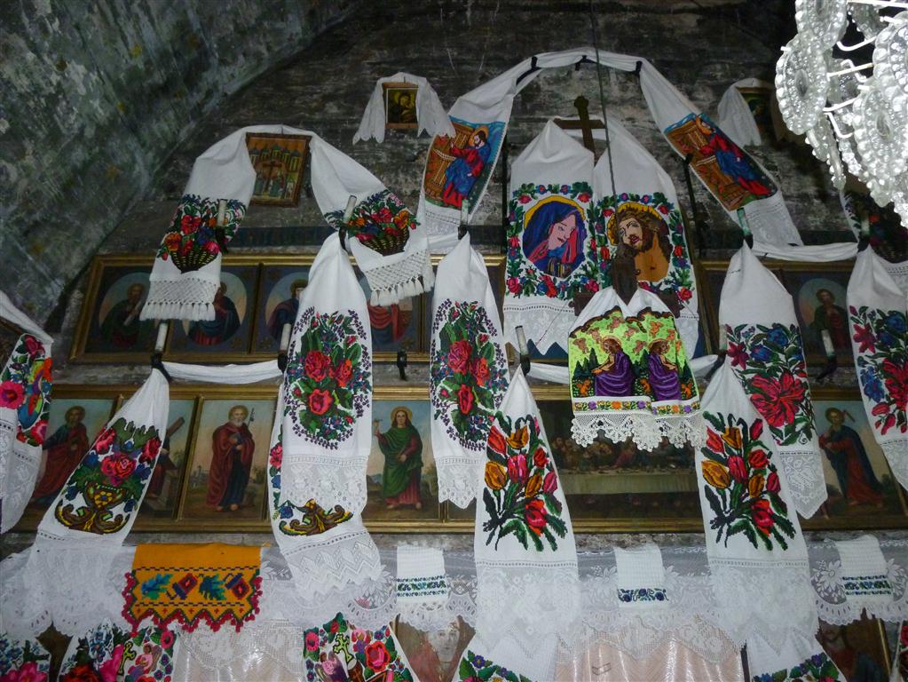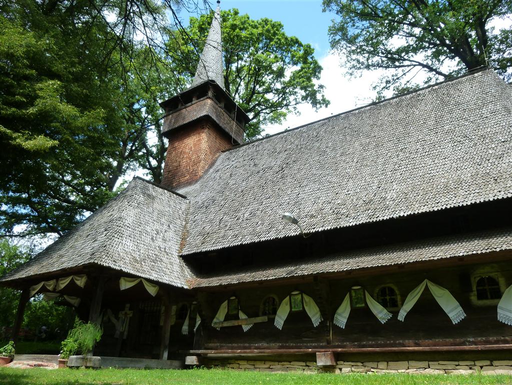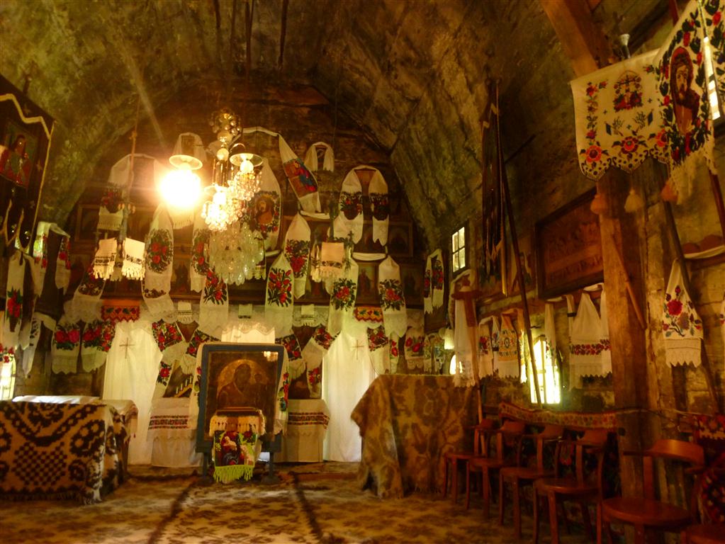 In Harnicesti, einem kleinen Ort ganz in der Nähe, besuchen wir eine der für hier typischen Holzkirchen aus dem 17. und 18. Jahrhundert. Auf meine Frage hin kommt der Kirchendiener und öffnete die verschlossene Pforte. Im Inneren Teppiche, alte Ikonen, teils unter Glas, teils an die Mauer gemalt und Trachtenborden als Verzierung.