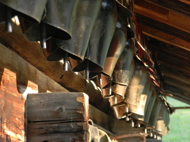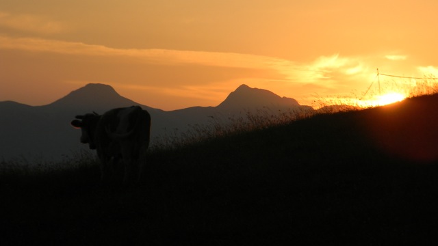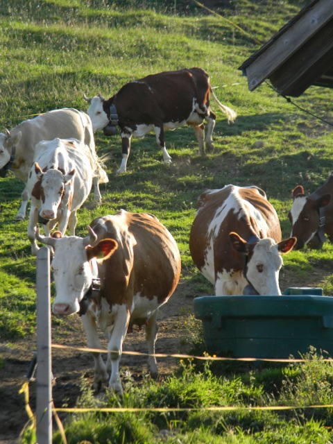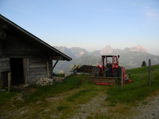 Gegen halb fünf dann richten des Milchgeschirrs (welcher Schlauch gehört nochmal wohin??) und nochmals kurze Jause („Z’vieri“), dann das Abendmelken. Die Kühe waren bis dahin im Stall, dementsprechend sieht er auch aus! Nach dem Melken werden sie in die Freiheit entlassen, Abbinden und Rausschicken erfordert immer etwas Mut (das Milchvieh hier hat – zum Glück!! – noch fast durchweg Hörner). Das Kuhglocken-Gebimmel der grasenden Kühe leitet so langsam den Feierabend ein, denn jetzt folgt „nur noch“ das ca. einstündige Stallmisten und Putzen, mehrere Kilo Kuhdung und Stroh werden der Jauchegrube zugefügt. Der Stall soll am nächsten Morgen wieder richtig schön reinlich sein, schließlich geben Kühe auch nur dann gerne viel Milch, wenn sie sich wohl fühlen. Dann Reinigung der Gerätschaften, der Stiefel und der eigenen Körperteile – und dann kommen Mensch und Berg zur Ruhe. Belohnung erhält man durch grandios inszenierte Abendhimmel inklusive Sonnenunter- und Mondaufgängen.