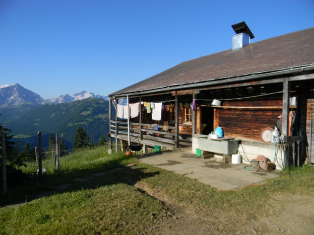 Die Almhütte, erbaut schätzungsweise vor 1850, beherbergt unter einem Dach den größeren Kuhstall, einen Schweinestall, die Küche mit Ess-/Arbeitstisch und großer Feuerstelle für das Käsen und Kochen. Dazu einen natürlichen Käsekeller, der auch im heißen Sommer eine Temperatur von maximal 15-16 Grad garantiert, einen Vorratsraum, die „Stube“ (das Schlafzimmer des Ehepaars) und, über Stall und Küche mit Falltür und Leiter erreichbar, mein gemütliches Gästezimmer und ein weiterer Schlafraum für die Töchter. Fließendes kaltes Wasser kommt von weiter oben vom Berg, Körperpflege erfolgt meist draußen am Trog mit Schüssel und Waschlappen, das WC ebenfalls draußen als einfaches, aber sehr sauberes Plumpsklo. Strom gibt es dann, wenn der Generator in der Zeit vom Melken angeworfen wird – eine Batterie wird aufgeladen, die abends für ein paar Stunden Licht reicht (und für das Aufladen der neumodernen Geräte der auswärtigen Helfer oder der Töchter – diese eine Steckdose erscheint für manche wie ein potentielles „Guckloch“ in die gewohnte technisierte Welt).