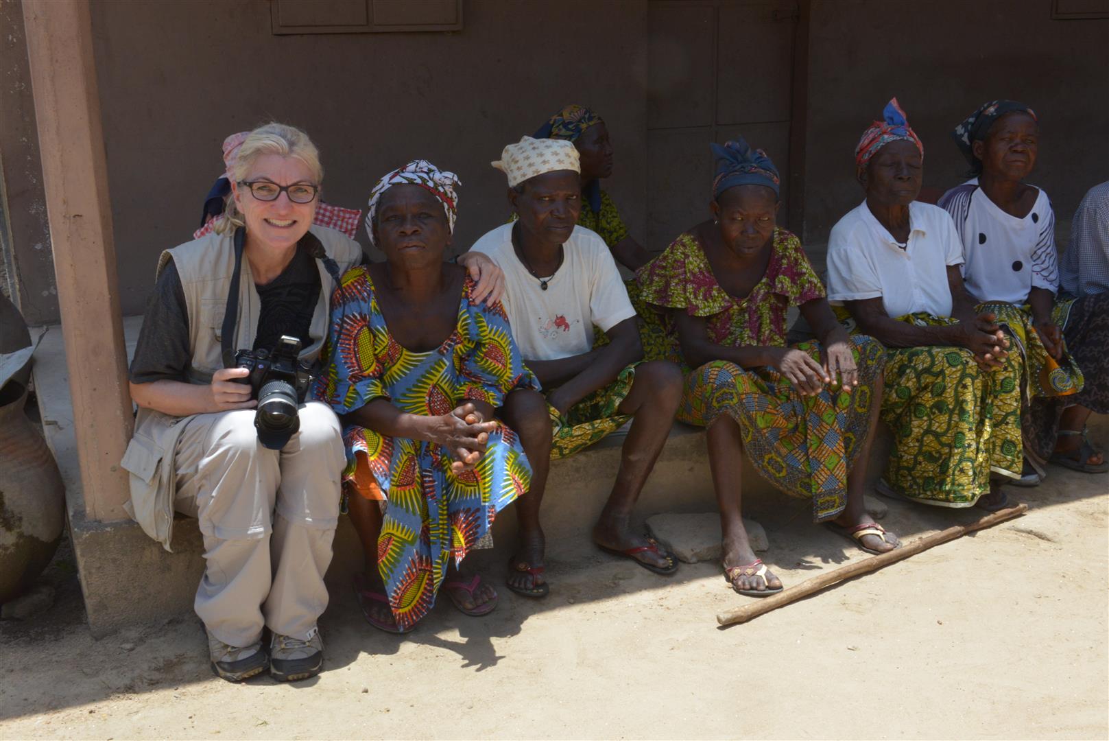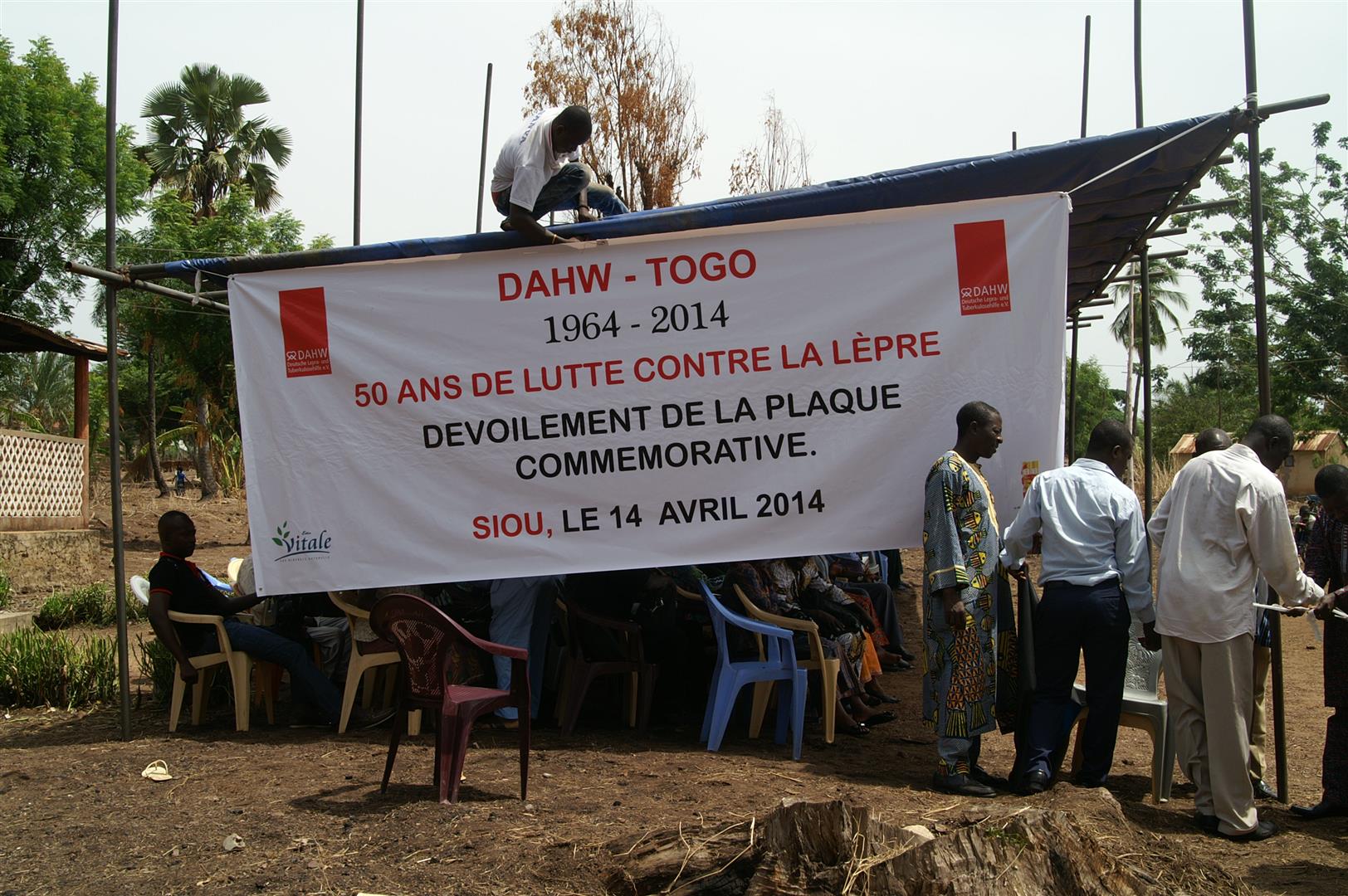 In einer Zeremonie für die Ahnen wird ein Huhn getötet, und das Blut auf dem Boden verteilt. Voodoo ist auch hier allgegenwärtig und es gibt Rituale, die man sich als normaler westlicher Mensch nicht vorstellen kann. Während ich im Nachbarstaat Benin lebte, habe ich vieles mitbekommen. Das rituelle Töten eines Huhns gehört noch zu den harmloseren Ereignissen. Ich kann es nicht sehen, wenn Tiere getötet werden und wende mich ab. Ein Kollege macht die Fotos. Alle warten gespannt auf den Höhepunkt des Tages, der Enthüllung der Gedenktafel an einer Wand neben der Gesundheitsstation. Es ist soweit. Der Jubel ist groß. Jeder möchte einen Blick darauf werfen: Die DAHW in Togo seit 1964!