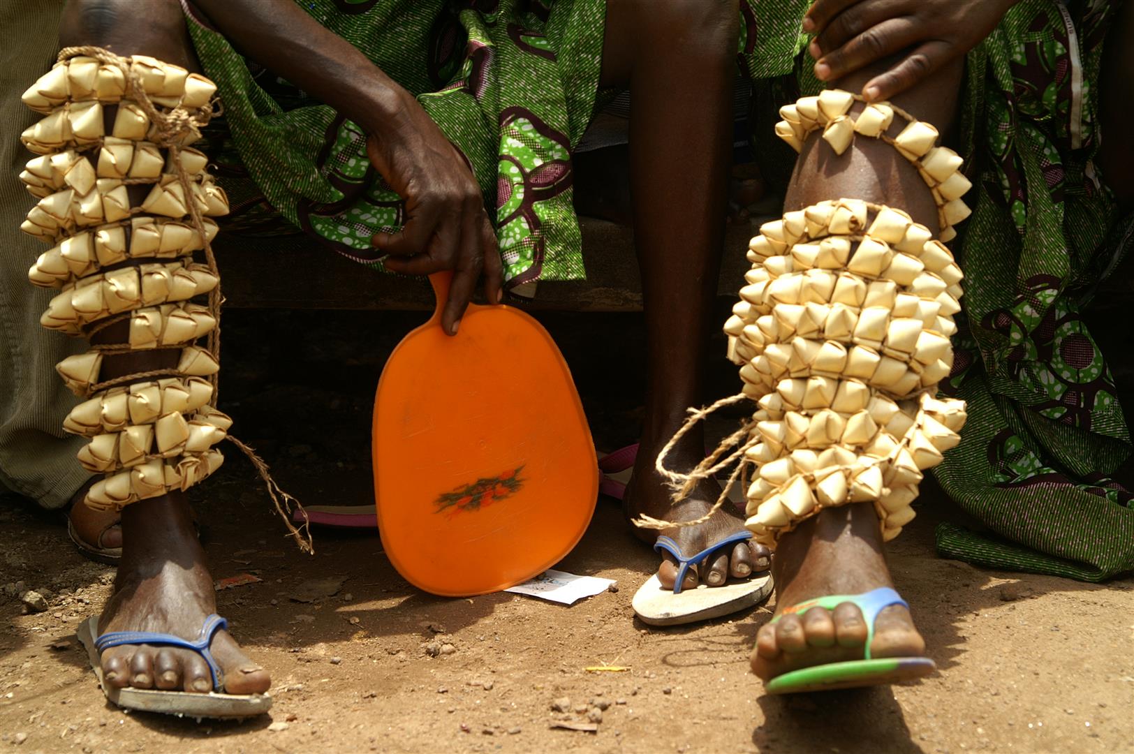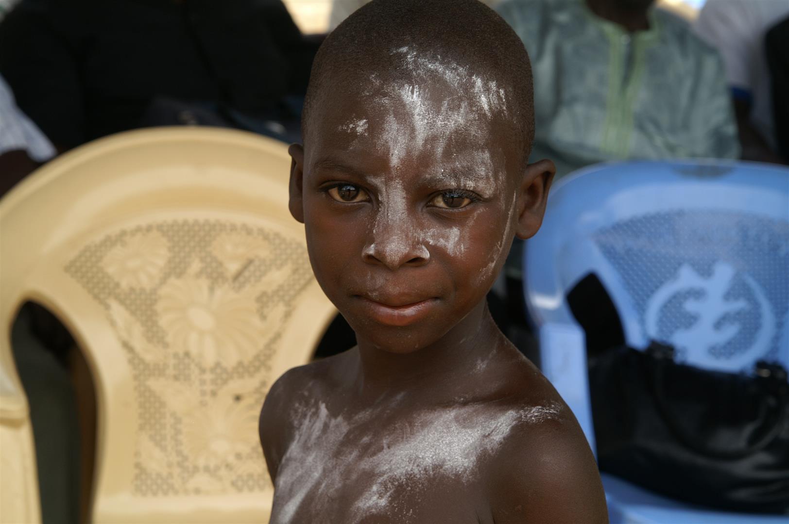 Der Dorfplatz ist voller Menschen. Viele tragen traditionelle Kleidung und haben weiß bemalte Gesichter. Trommeln werden herbei getragen und in der Mitte aufgebaut. Ein Banner weist auf das 50-jährige Engagement der DAHW in Togo hin. Bald beginnt die Trommelgruppe zu spielen. Die Musik steckt an. Immer mehr Menschen finden sich auf dem Platz zusammen und laufen tanzend und singend im Kreis. Wir sitzen auf Stühlen unter einem improvisierten Plastikdach. Ohne das könnten wir die Hitze kaum aushalten. Mittlerweile ist das Thermometer auf 36 Grad angestiegen.