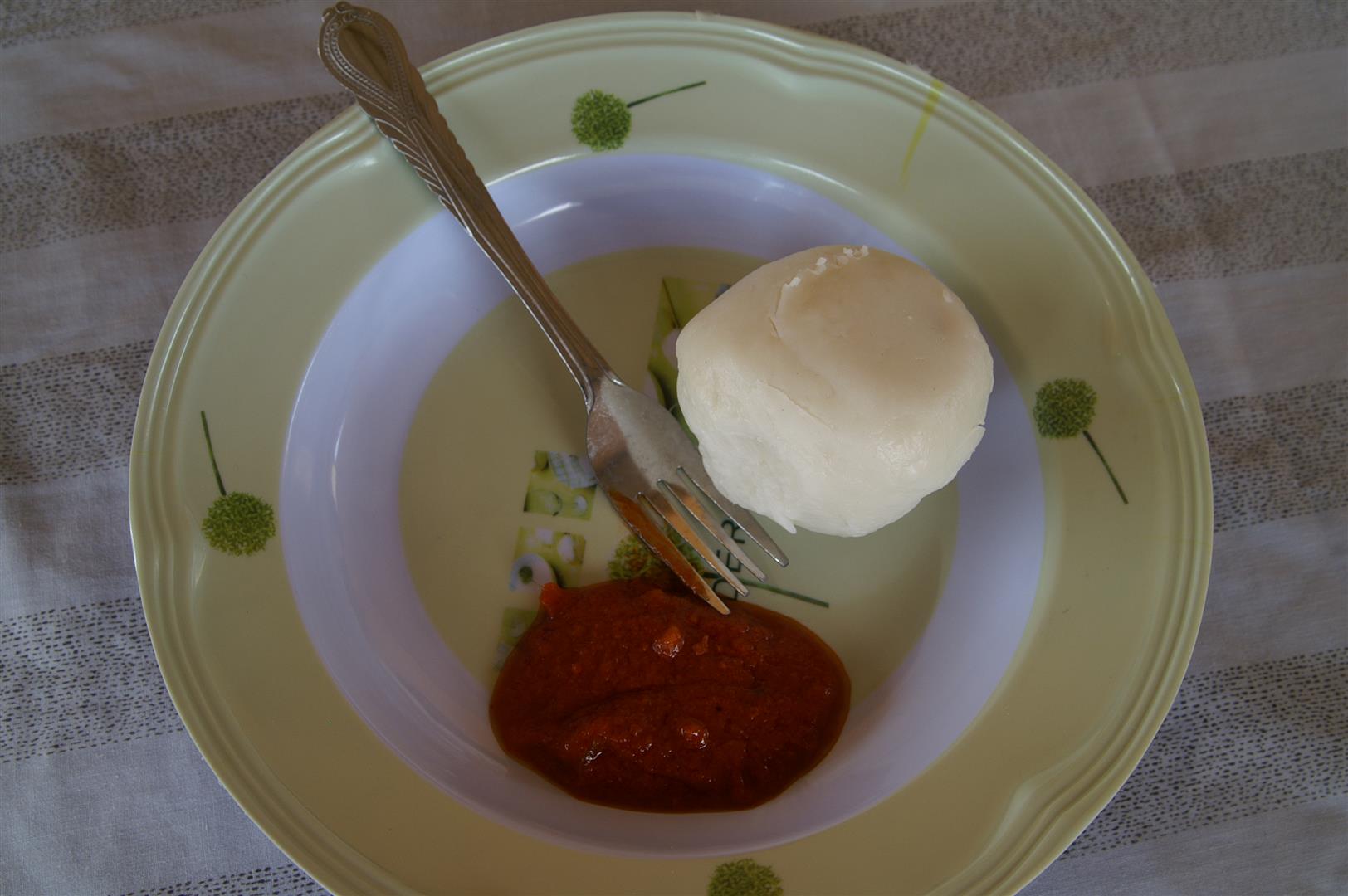 Erneut setzt Trommelwirbel ein. Menschen tanzen, klatschen in die Hände und jubeln. Die Dorfvorsteherin, Madame Barandao, lädt uns zum Essen in ihr Haus ein. Es gibt Maisbrei mit Tomatensauce und Hühnchen. Als Vegetarierin esse ich kein Fleisch. Der Maisbrei schmeckt fad, ist mit der würzigen Sauce sehr schmackhaft. Auch ohne Fleisch, das überall und in jeder Art angeboten wird, finde ich leckere Alternativen, um satt zu werden.