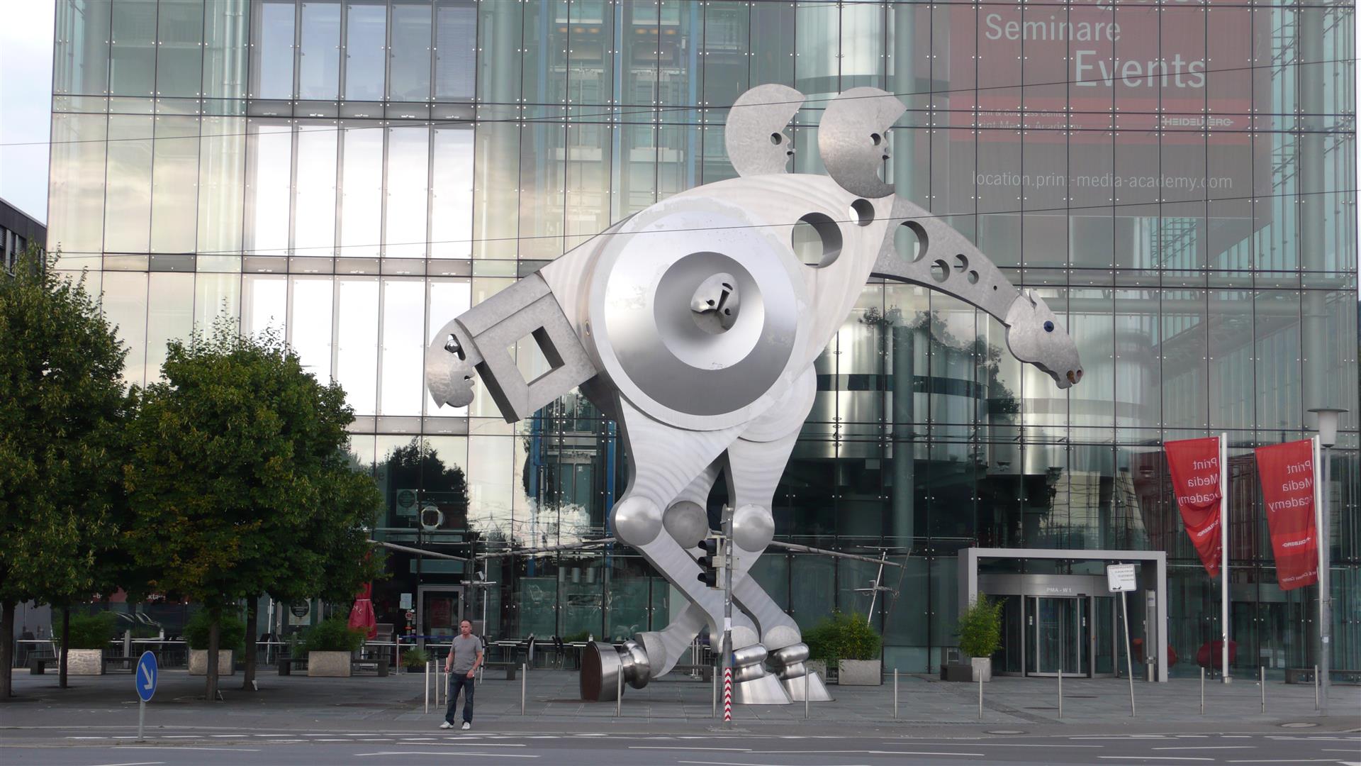 Im Gegensatz zu den klaren Formen des Gebäudes der Print Media Academy wirkt das „S-Printing Horse“ auf dem Vorplatz verspielt. Mit 13 Metern Höhe, 15 Metern Länge, vier Metern Breite und 90 Tonnen Gewicht ist es eine der größten Pferdeskulpturen der Welt.