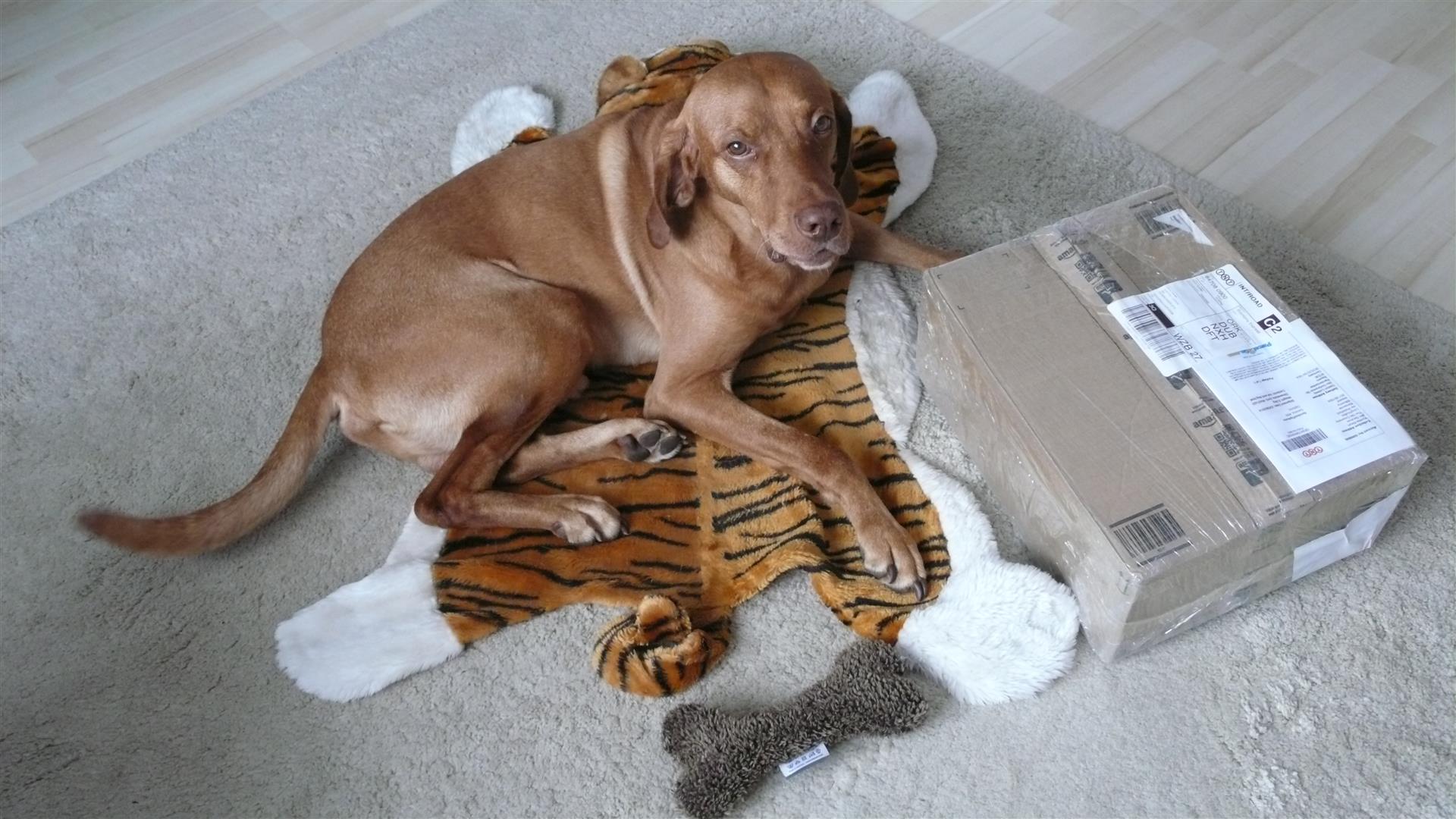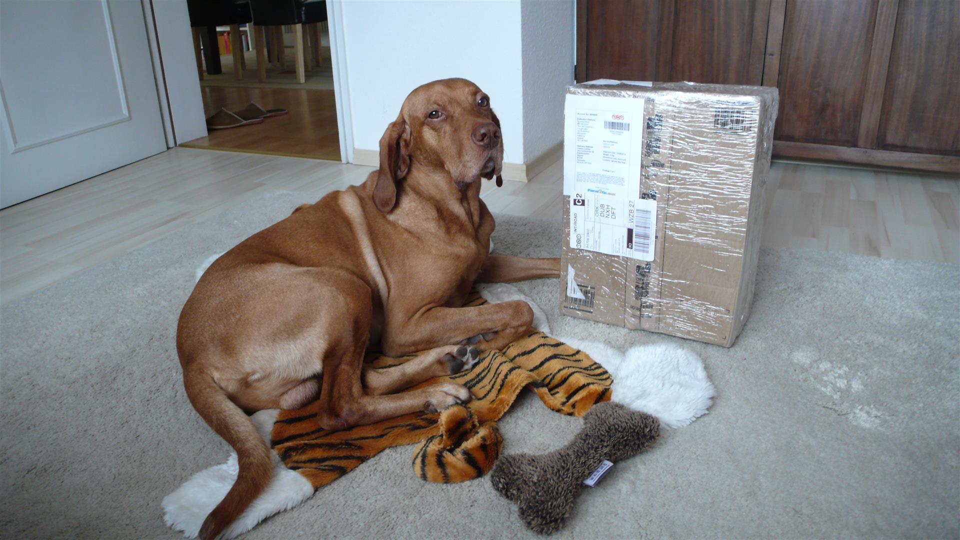 Today at 7.30 am the postie man was ringing the bell and brought a huge parcel. I could not believe it, it was for me! From my dear Irish friend Ozkar and his Mum. Because my Mum went to work I had to wait till the evening. I was so curious. And finally I could open it … Look what I got!!