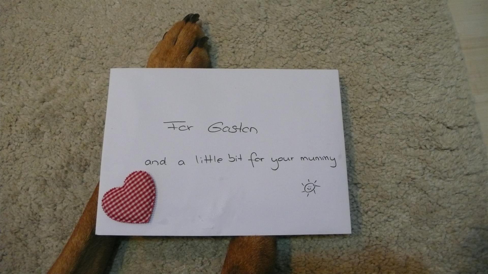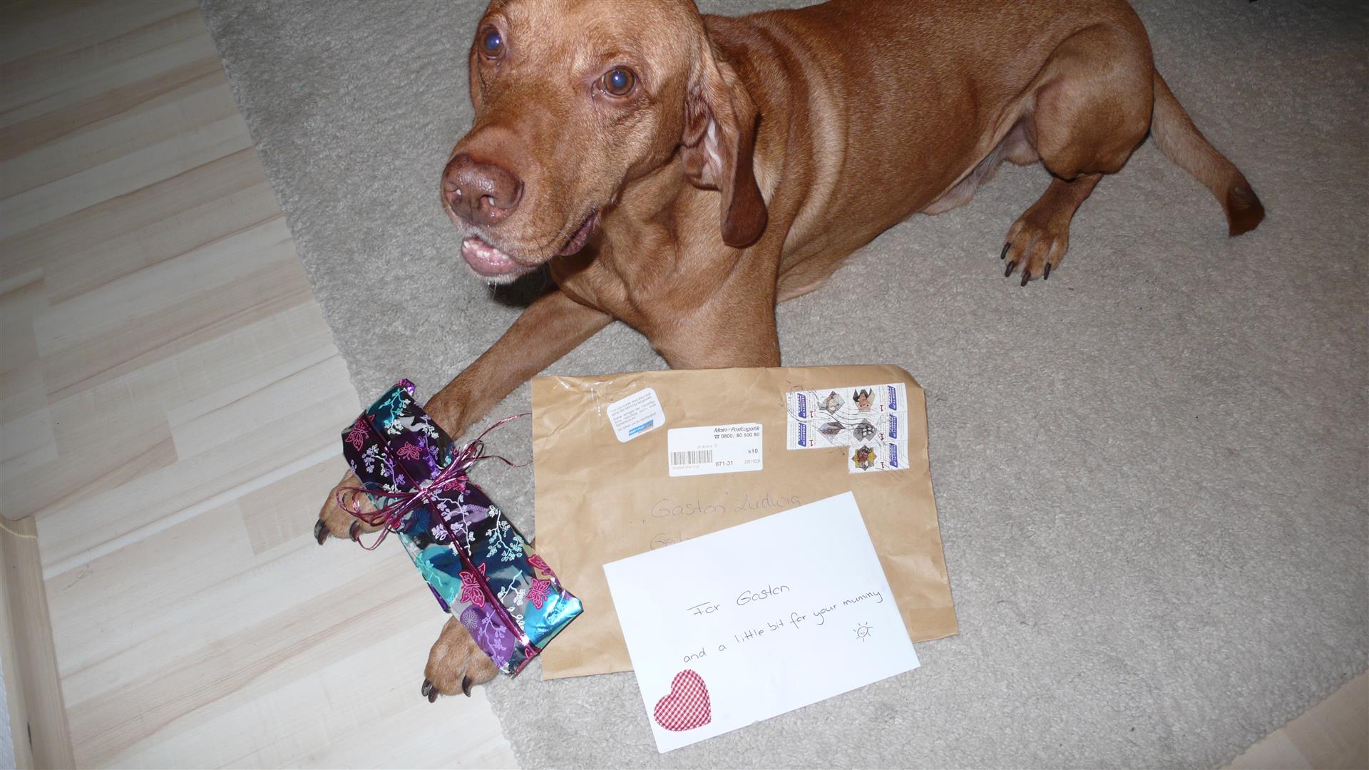 It was the same procedure as yesterday. The Postie Man rang again early in the morning. I slept very deep, but, of course, I woke up. Because: Could be something for me! And, indeed, it was. A big letter from Holland. From my Facebook friend Jelle and his Mum Anja. For open that precious jewel I had to wait till the evening. Finally Mum arrived from work. I was so curious I got already a heart stroke. Oh my Dog! Slowly, very slowly, Mum opened the treasure. And, yeah, yeah, yeah, it was a beautiful collar. Handmade and very individual. Fits wonderful to me. Thanks, dear friends in Gouda, I am very happy!
