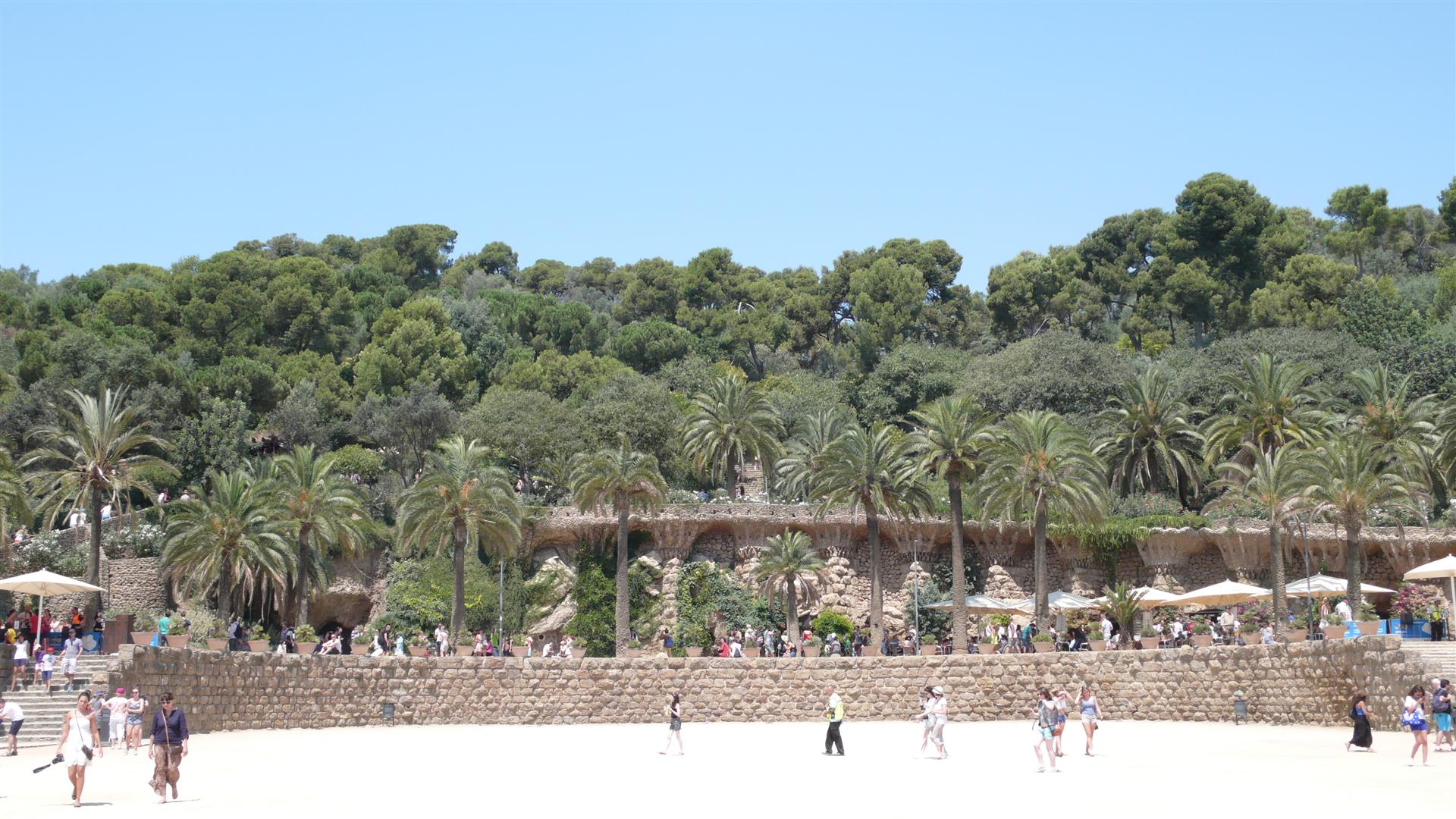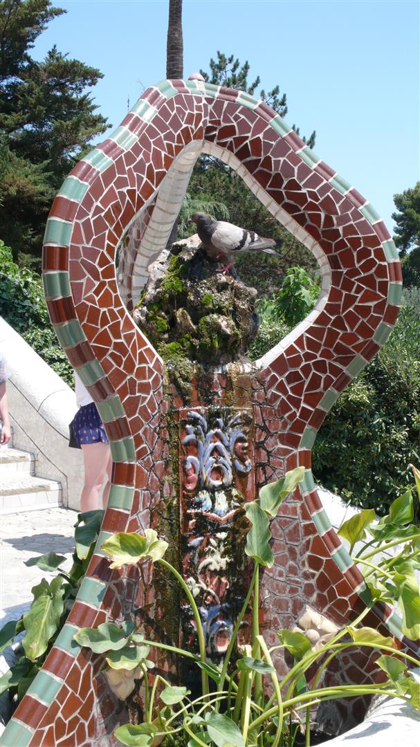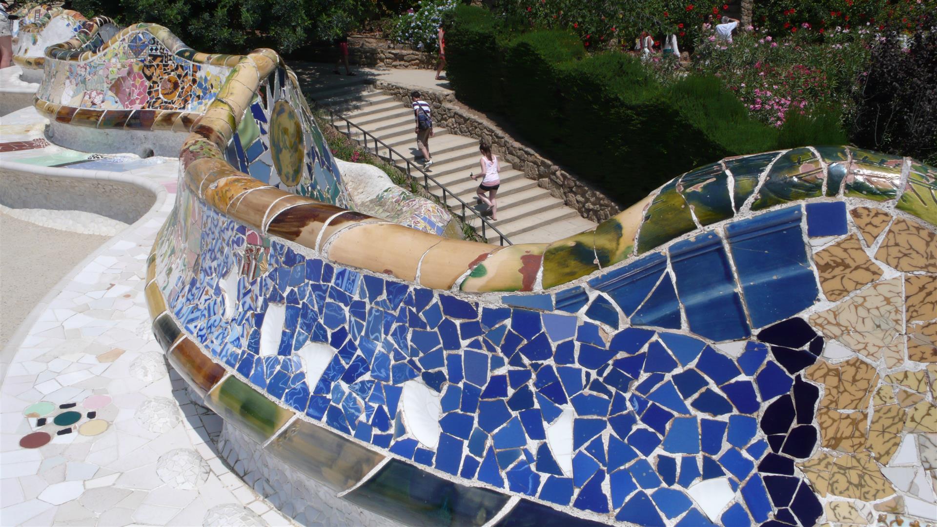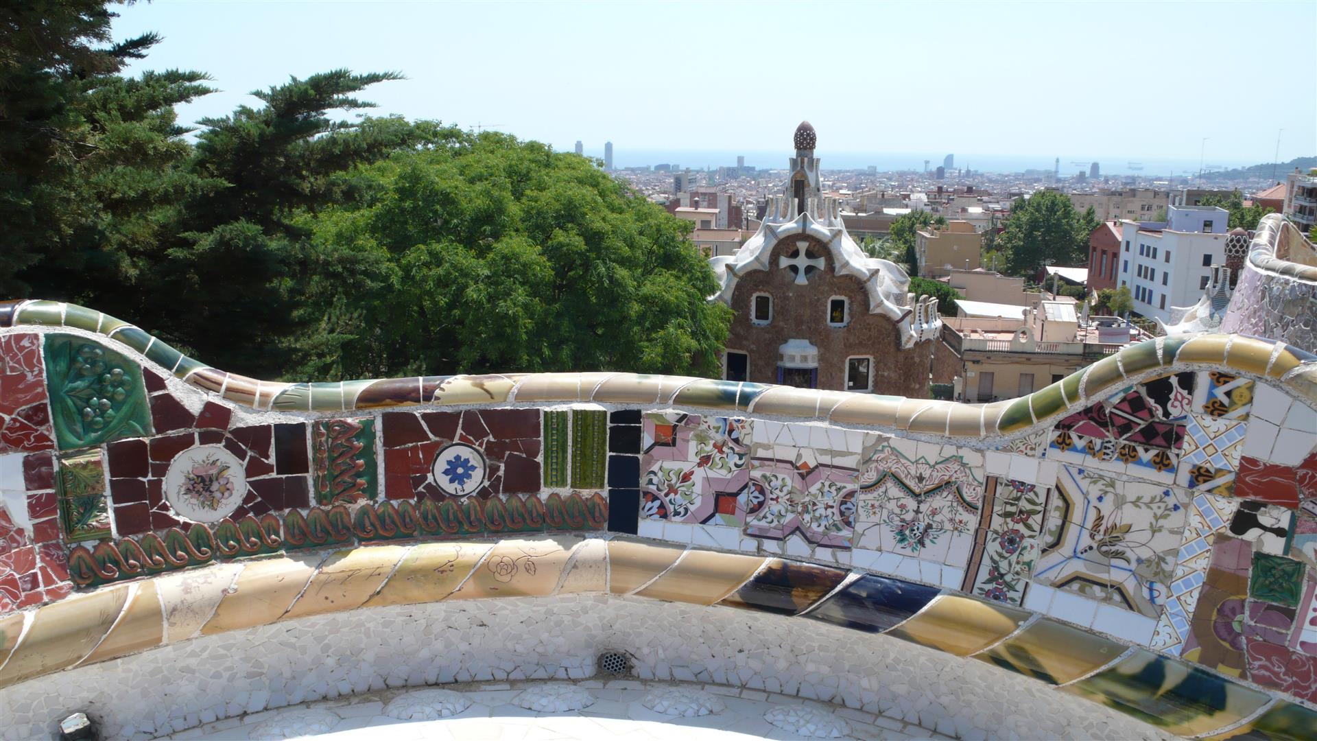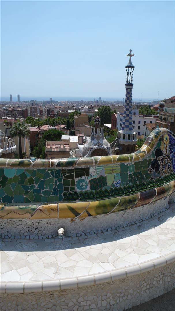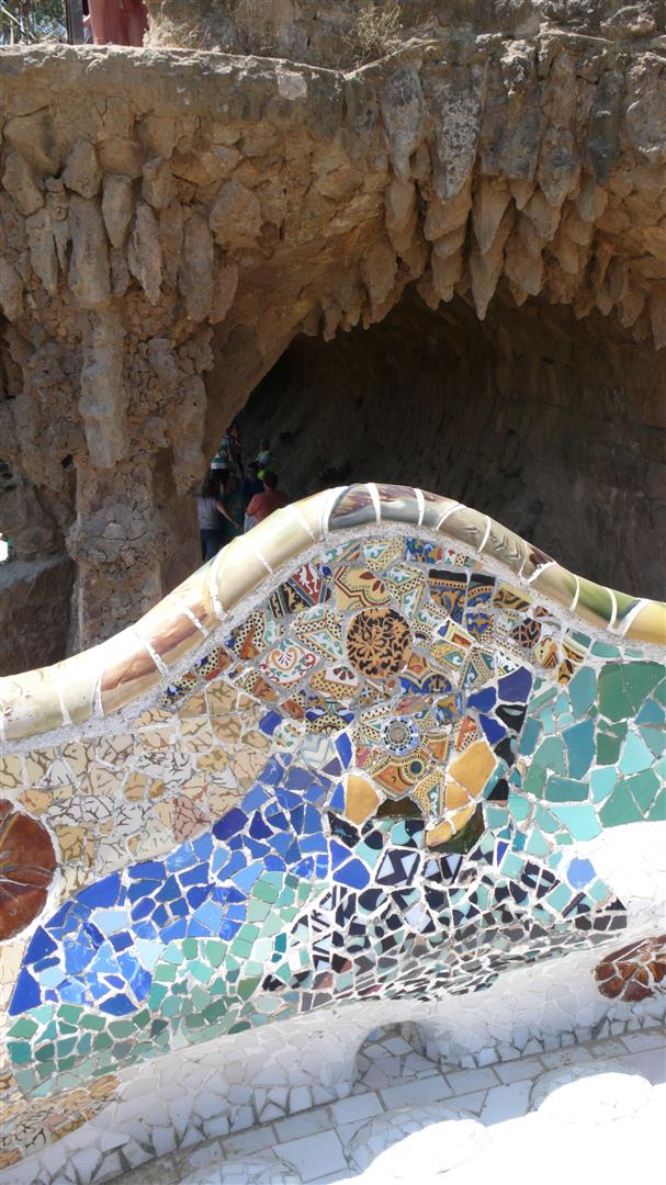 Der Park Güell, erbaut von 1900 – 1914, war der Versuch, mitten in der Natur eine Wohnsiedlung zu errichten. Antoni Gaudí wendete bei diesem Park alle seine Kenntnisse an und setzte in ihm seine urbanistischen Vorstellungen um. Es gibt keine einzige gerade Linie, alles ist gewellt und schräg. Die Säulenhalle, die als Markt gedacht war, stützt die beeindruckende Freiterrasse. Nicht unerwähnt bleiben sollte, dass der Architekt Josep Maria Jujol i Gibert einen wesentlichen Beitrag zur Erschaffung der Sitzbank leistete.