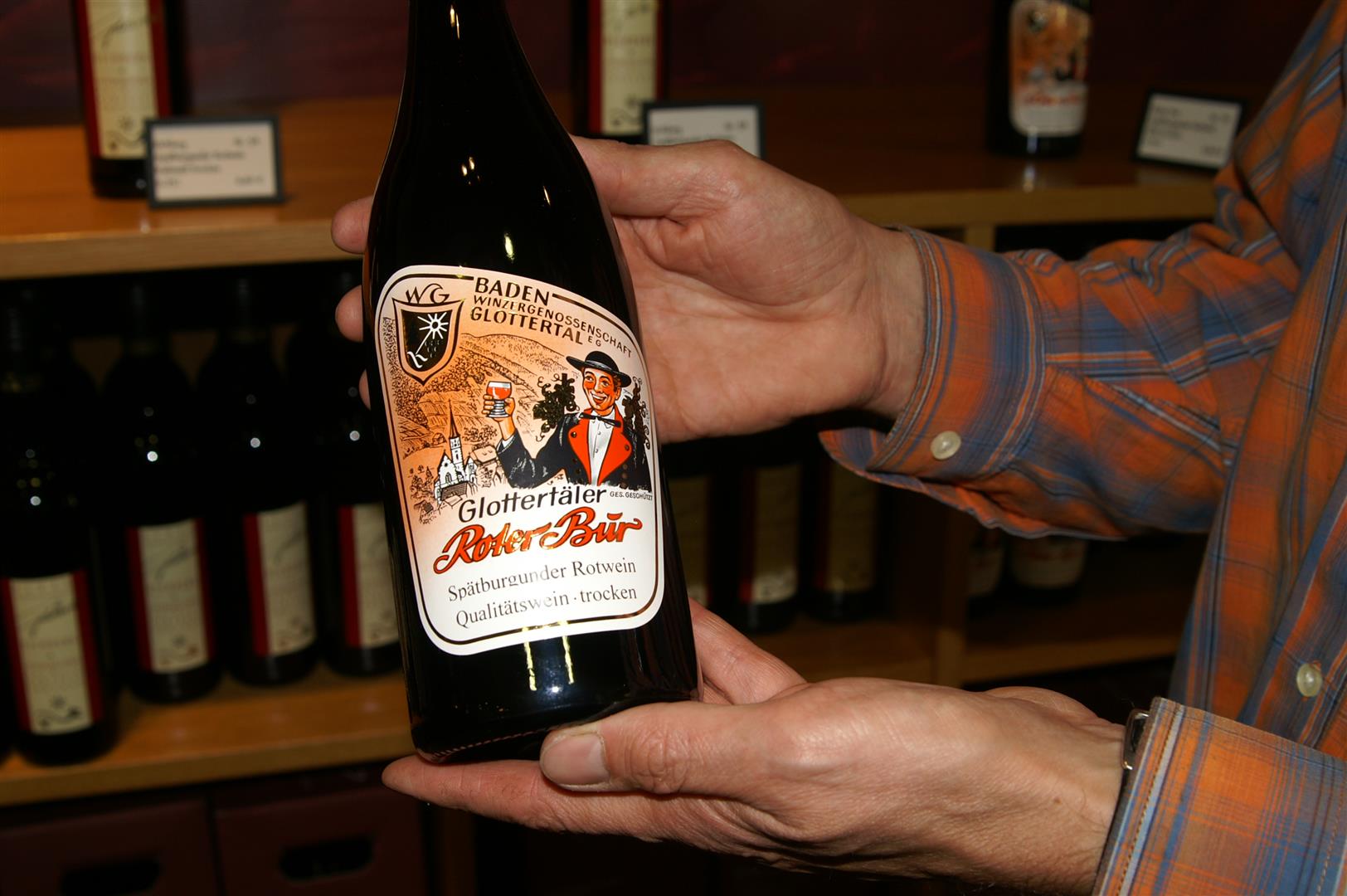 Er selbst sei mit der Flasche groß gezogen worden. Was immer das auch heißen mag: Der Mittfünfziger kennt sich bei Weinen bestens aus. Kein Wunder, den Betrieb leitet er seit einem knappen Vierteljahrhundert. Er deutet auf eine Flasche „Roter Bur“ vom legendären Rotburenhof, dem in früheren Tagen die besten Parzellen des Glottertäler Eichbergs gehörten. Auch heute spiegelt er in Qualität und Geschmack einen Spitzenwein wider.