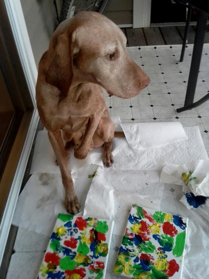 He is the Monet of the dog art world: Steven Beaupre. The wise Vizsla boy knows what doggies like. Here it is: The precious Christmas present from my Texan fiancée Lexi: A paw painted work by Steven. Lexi knows that I am an Art Lover. She chose the best for me. And the special surprise was that she got just the same painting for her too. From Steven! He painted it also for her. I just cannot bark how happy I am.