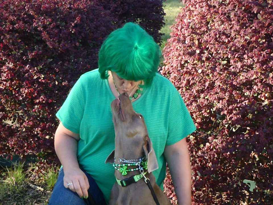 We met with Linda Laughlin, let’s just say that was not a good day. For one I had to ride in a crate, while Fatty got to ride up front. When I got to meet the trainer, I lunged and barked at Linda just like I have done with past potential adopters and Papa for months. The plan is to go to training every two weeks and it has made all the difference in the world. I don’t bark at Papa any more, but I still don’t like Fatty. I know how to avoid him though, so all is good. In fact the training worked so well that Mama and Papa decided to adopt me for their very own on March 24, 2012. I had a virtual party on-line that day called Hans Green Day, 182 people from around the world posted pictures of their favorite dogs wearing something green in my honor. I also gave back to Arkansas Weimaraner Rescue by promoting their cookbook with a „Pawtographed“ edition by me and my brother and sisters. Sold them out, 54 copies went to 5 different countries. Included in each copy was handwritten sheet with my Ponsy Prayer, on green paper of course.