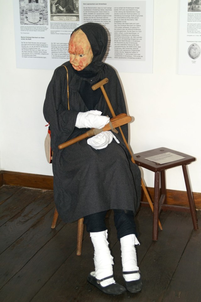 Zwei lebensgroße Figuren begrüßen die Besucher des Lepramuseums in Münster. Unheimlich sehen sie schon aus in ihren weiten grauen Mänteln und den groben, entstellten Gesichtern, die ihnen die Krankheit gegeben hat. Fast echt wirken sie in der originalgetreuen Umgebung des Hauses, das erstmals 1333 in den Urkunden der Stadt Münster als Leprosarium Erwähnung fand.