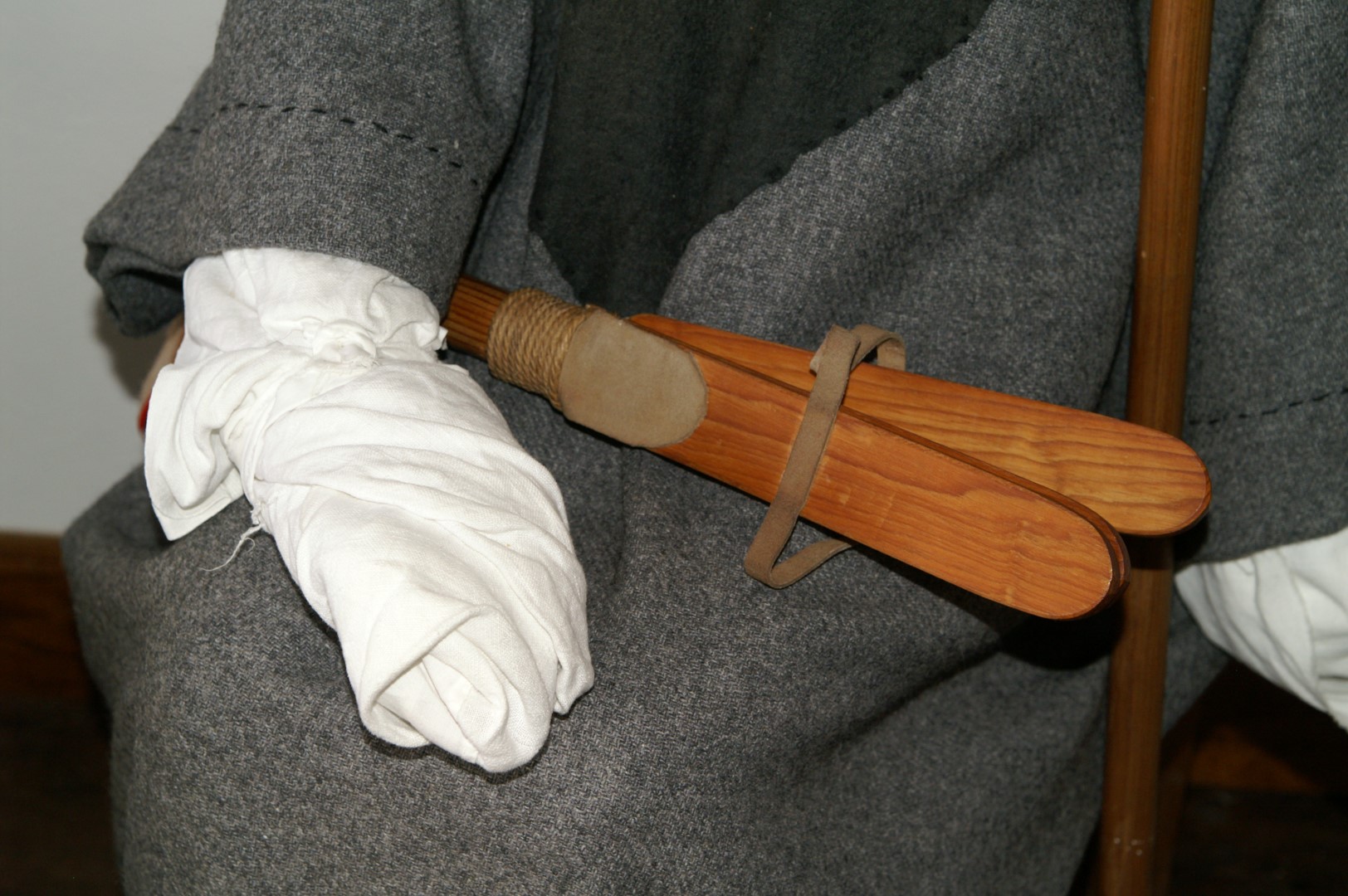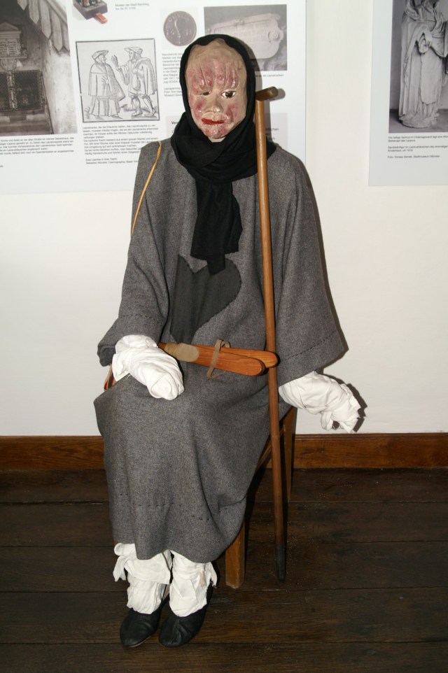 Um als solche erkannt zu werden mussten Leprakranke über ihrer Kleidung einen Siechenmantel tragen. Er trug somit zu ihrer Isolierung und Stigmatisierung erheblich bei. Nicht fehlen durfte die Siechenklapper, durch deren scheppernden Lärm die Betroffenen gesunde Personen vor sich warnen mussten. Das Instrument bestand aus drei losen miteinander verbundenen Holzstücken und verursachte die typische Melodie der Leprakranken, wenn sie auf den Straßen unterwegs waren.