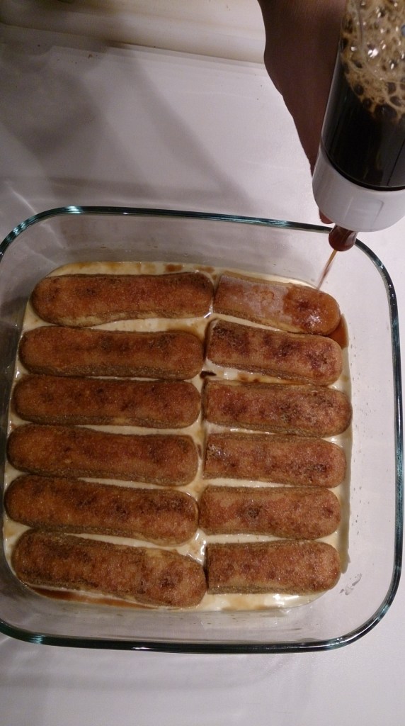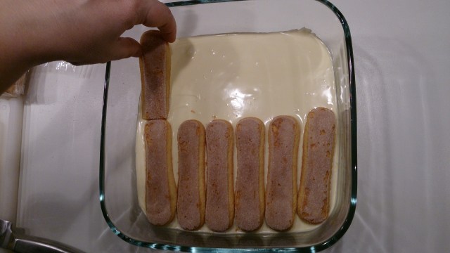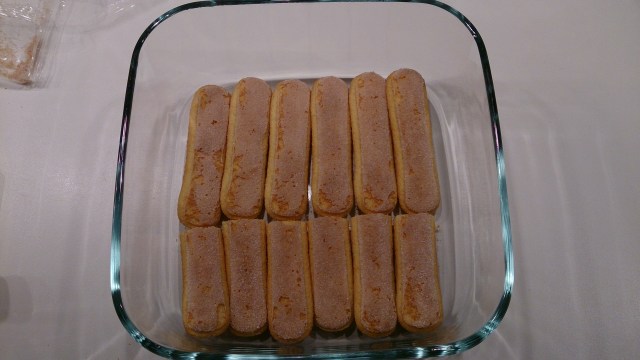 In una pirofila creare il primo strato di biscotti savoiardi (Foto 9).