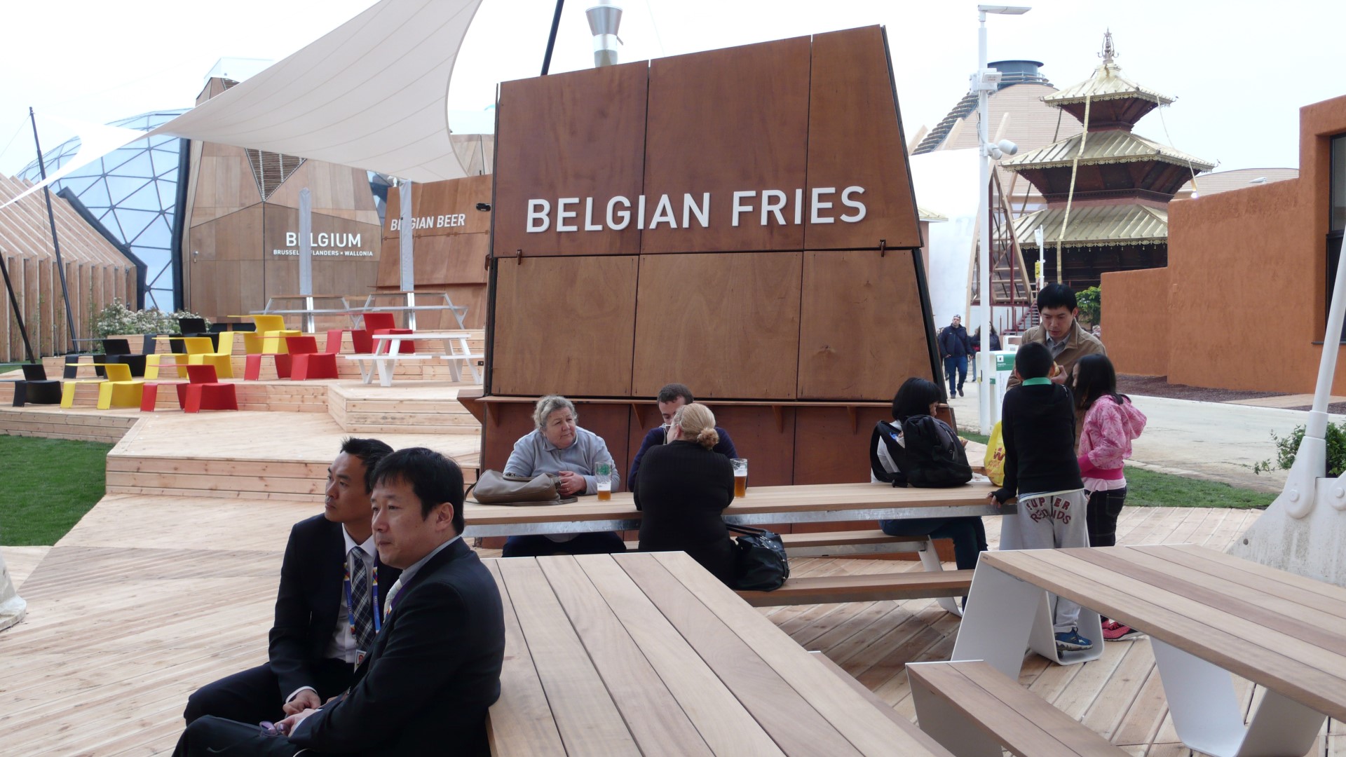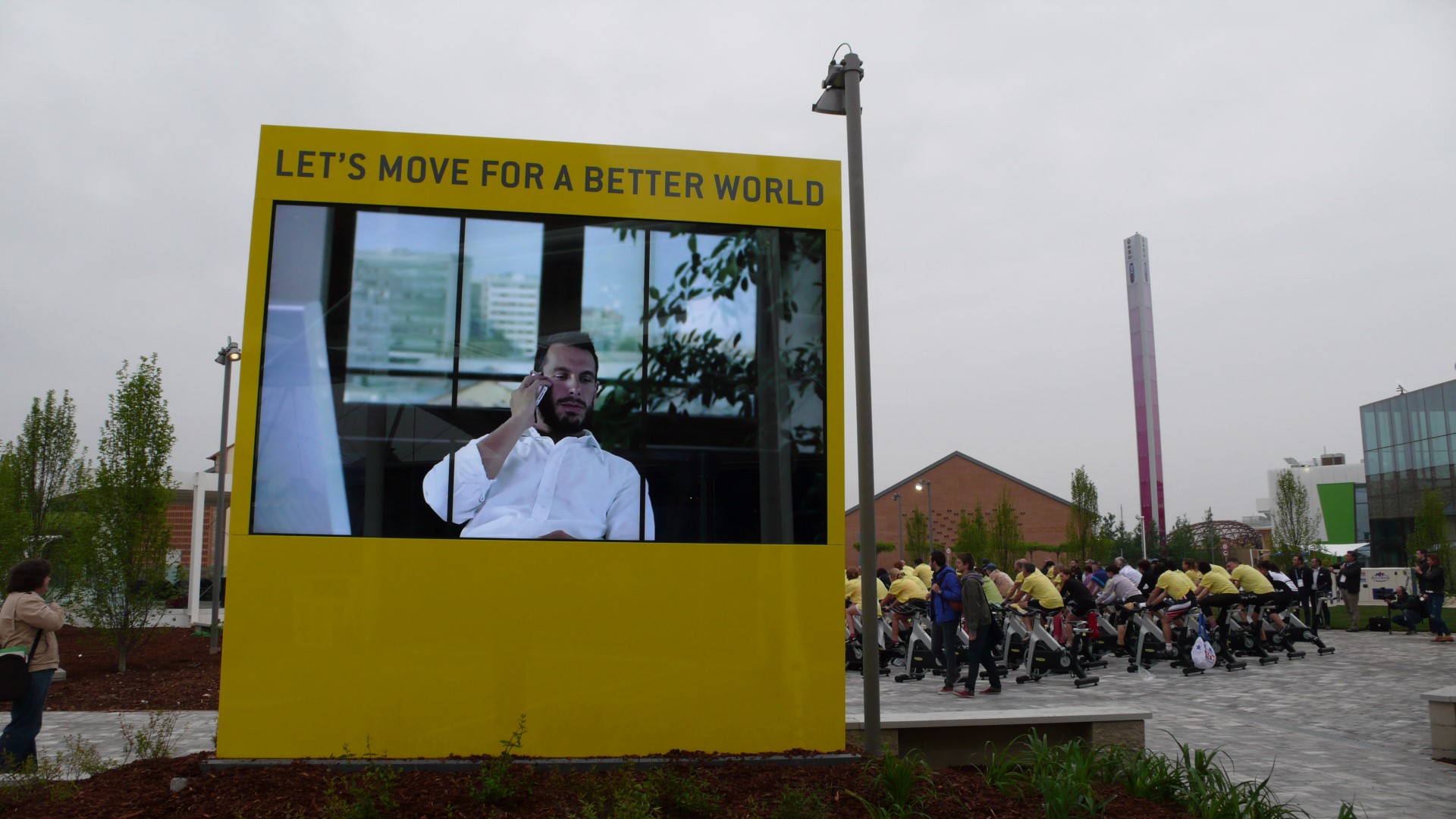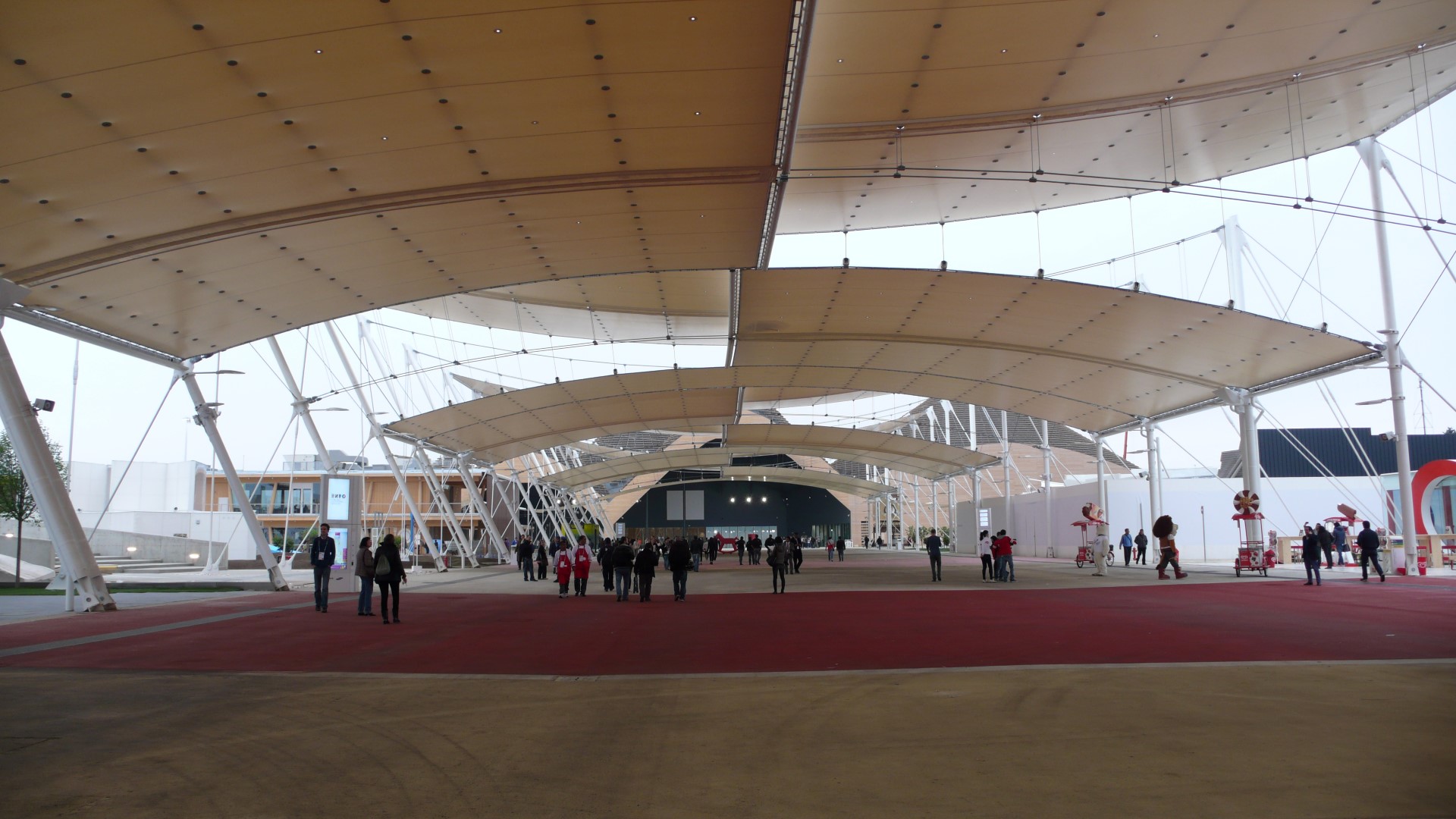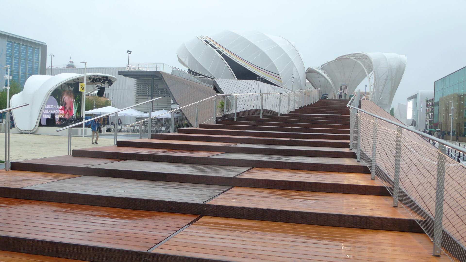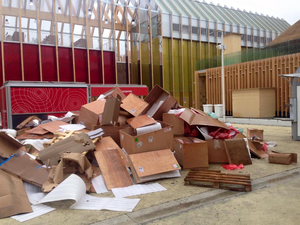Dagegen: Eine Kampfjet-Demonstration am Himmel über der Weltausstellung mit den Farben der Trikolore. Italien zeigt sich heroisch. Trotz nicht fertig gestellter Pavillons, in denen Kabel wirr herumliegen und Löcher in den Fliesenböden Stolperfallen bedeuten, Bauschutt, den Besucher erst überwinden müssen, um in geöffnete Pavillons zu gelangen und eine nicht fertig gestellte U-Bahnlinie. Dazu Korruptionsvorwürfe, Bestechungsgelder und Konzerne wie Coca Cola und McDonald’s als Sponsoren einer Schau zur verantwortungsbewussten Ernährung!