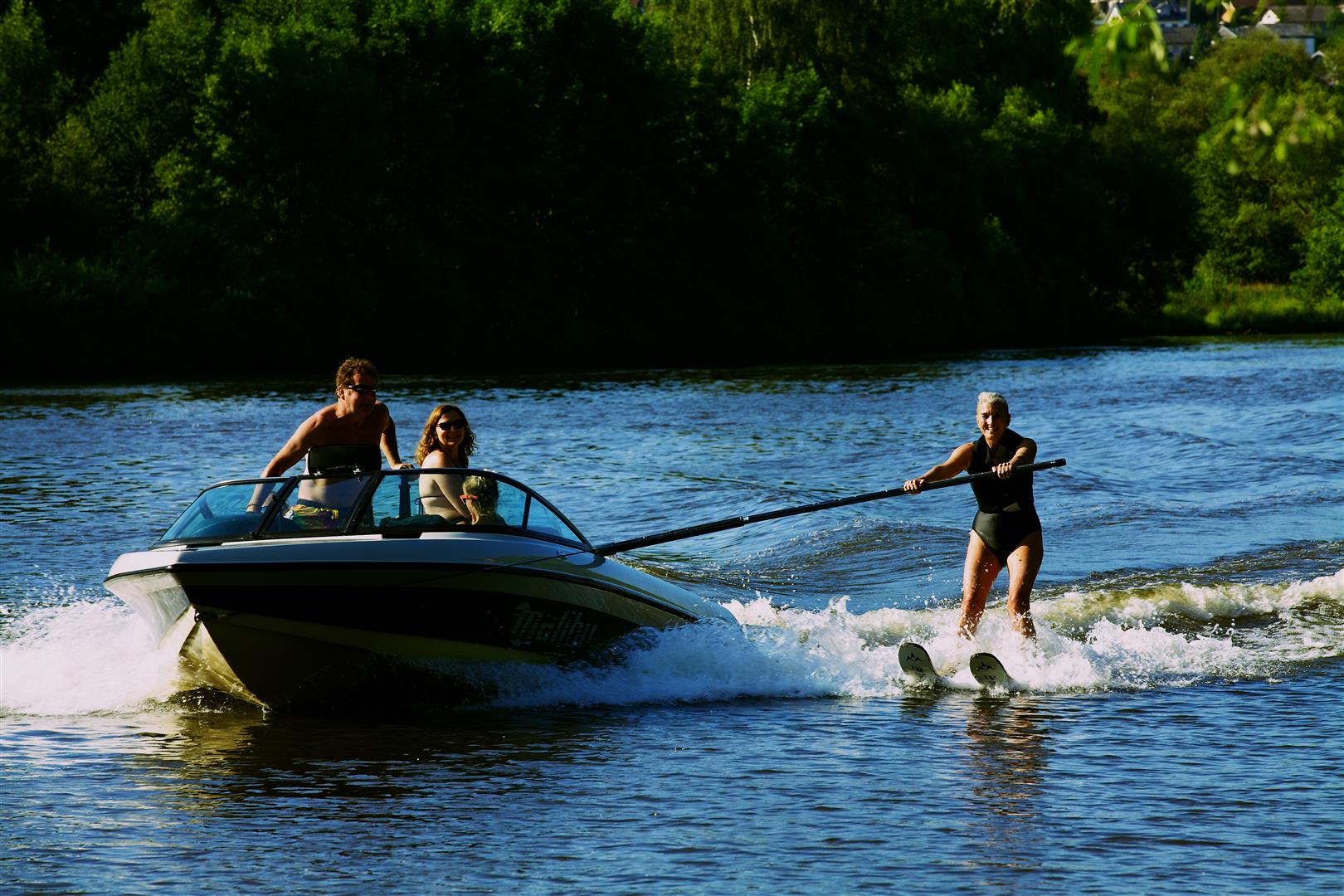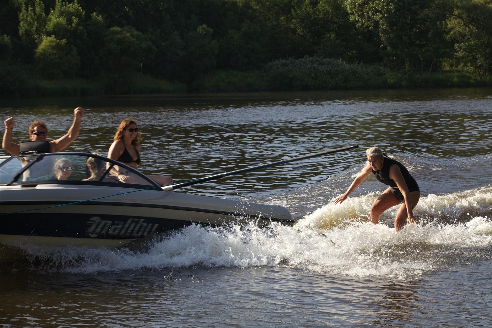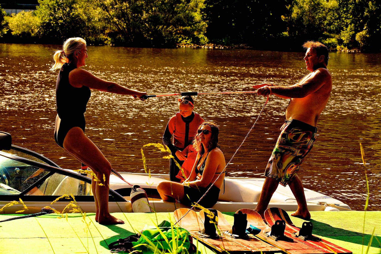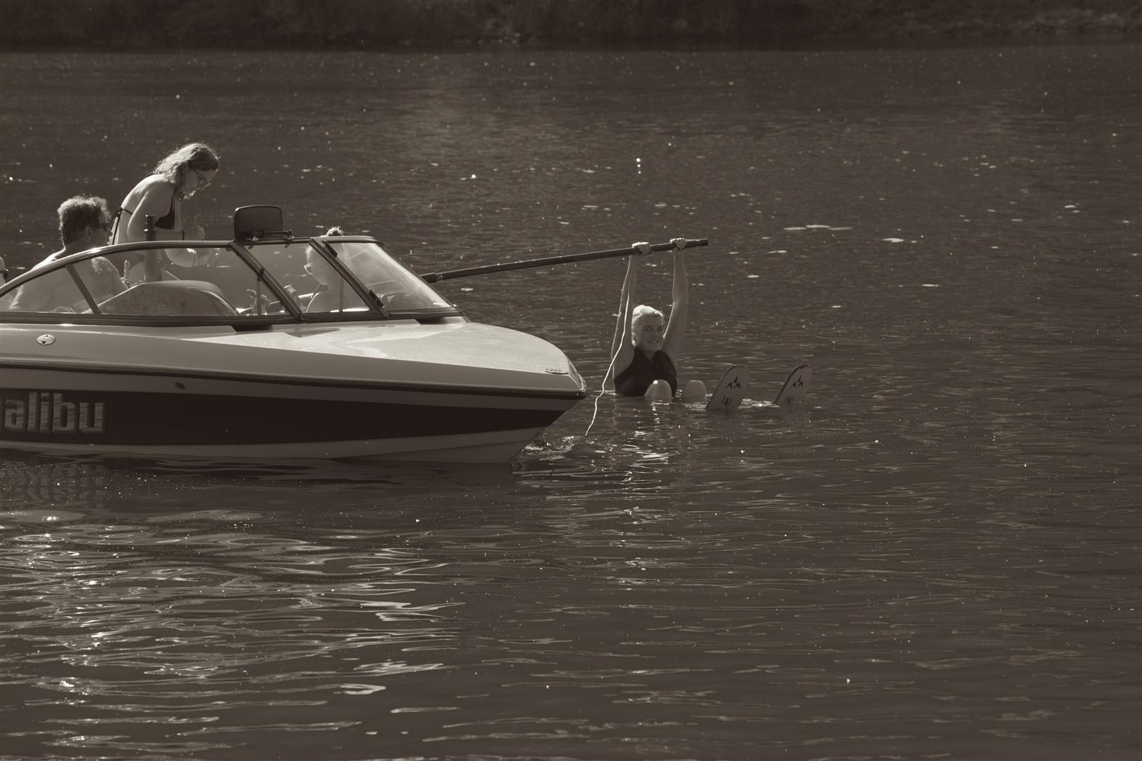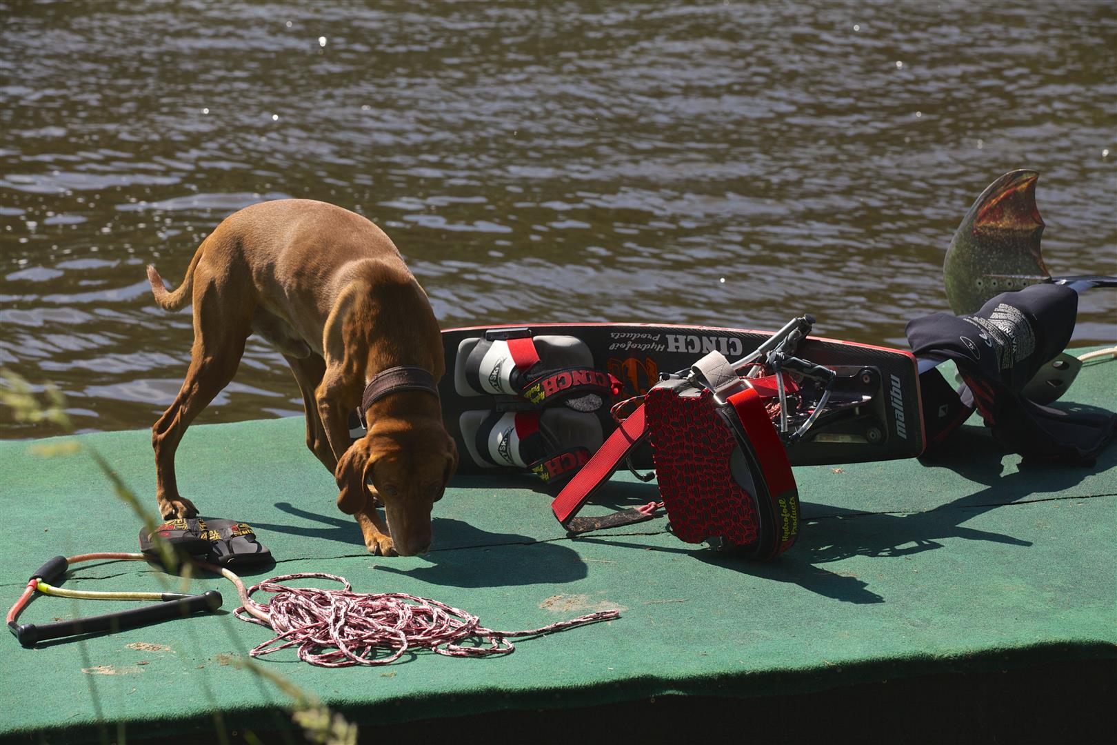 Au weia, Frauchen lernt Wasserski. Sie will immer alles probieren. Und ich finde, dass sie überhaupt nicht sportlich ist. Gar nicht! Sie denkt, dass sie es ist. Aber ich weiß es besser! Ich hoffe, sie fällt nicht. Ja, sie kann schwimmen! Ganz gut sogar! Besser als ich!
