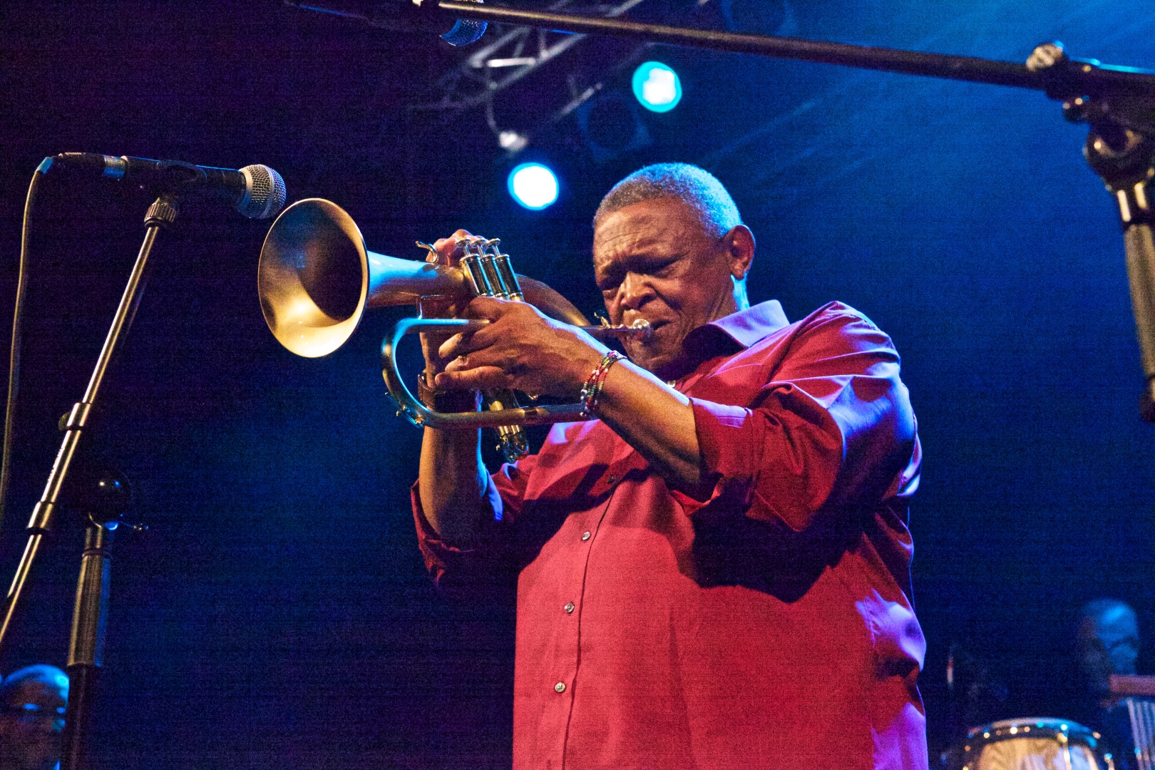Masekela reißt mit, bringt Energie, erzählt dazwischen immer mal wieder aus seinem Leben: Über Miriam Makeba, der anderen großen Stimme Südafrikas, die übrigens mit ihm verheiratet war. Wenn auch nur kurz, aber er huldigt die längst Verstorbene durch seine Musik, bringt Töne hervor, die Gänsehaut auf die Haut der Besucher zaubern. IMG_3460 (Large)Lustig wird es am Schluss, als er erzählt, dass er in Wiesbaden geboren sei. Ja, eigentlich, sei er Deutscher. Der dann aber ganz zufällig in den Fluss fiel, der ihn weitertrug Richtung Mittelmeer, noch weiter Richtung Ozean und ihn schließlich in Kapstadt ausspuckte. Direkt in den Schlamm, mit all den Robben und Walrössern daneben, sei er dann schwarz geworden. Einfach so. Und dass sein eigentlicher Name Klaus Adolf sei und ihn doch bitte alle „Klaus“ rufen sollen. Der Mann hat Humor. Die Besucher danken es ihm und seiner Musik mit ausgiebigem Tanz und einem langen Applaus.IMG_3454 (Large)Fotos: Enric Boixadós