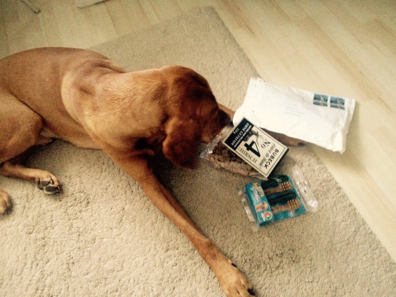 Odie, ohhh Mannomann, fantastisch! Ein Päckchen für mich! Nur für mich! Mit Leckerliiis! Ganz vielen!