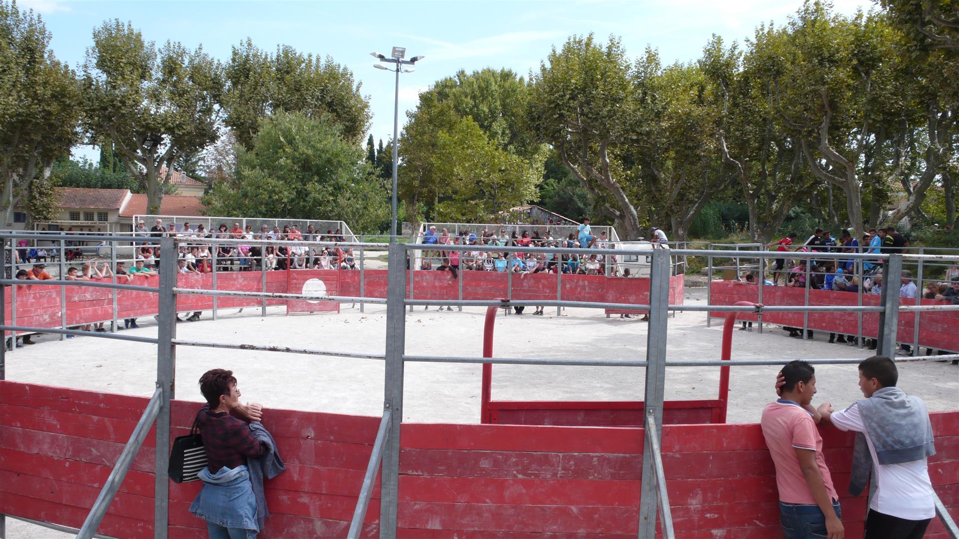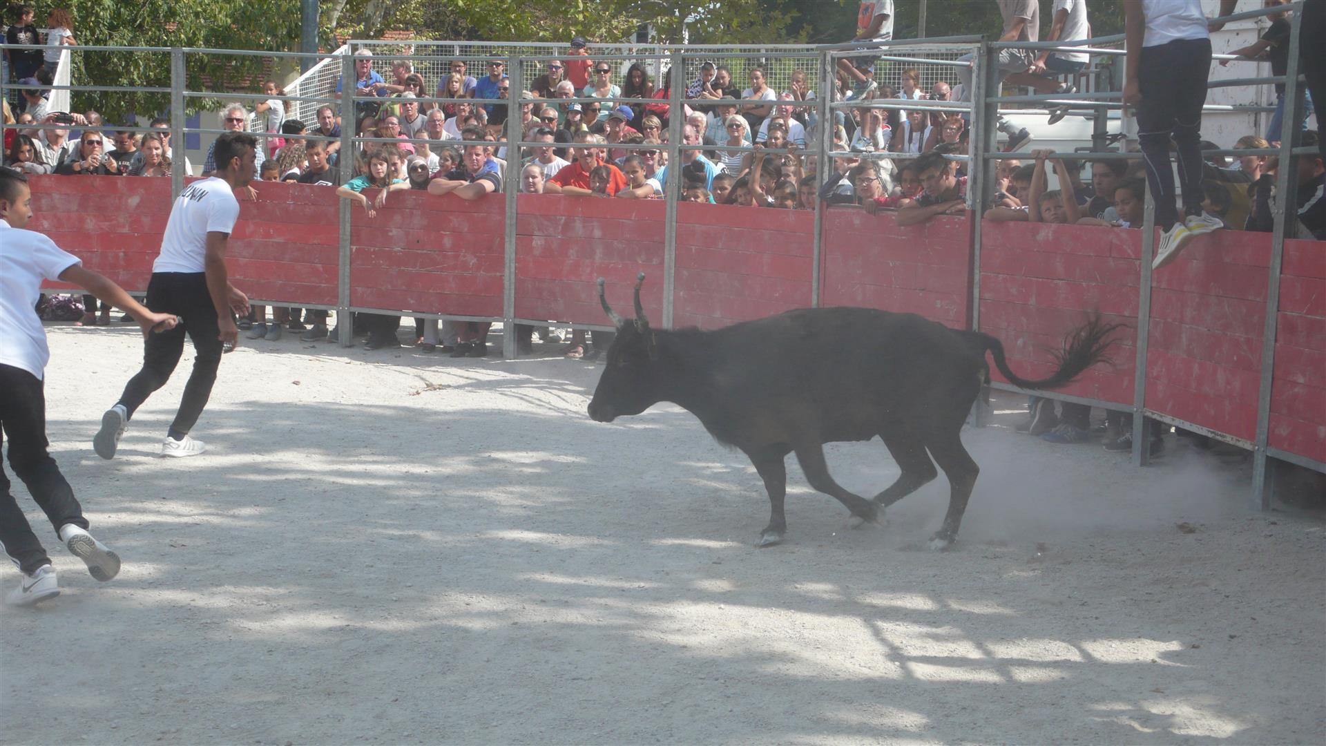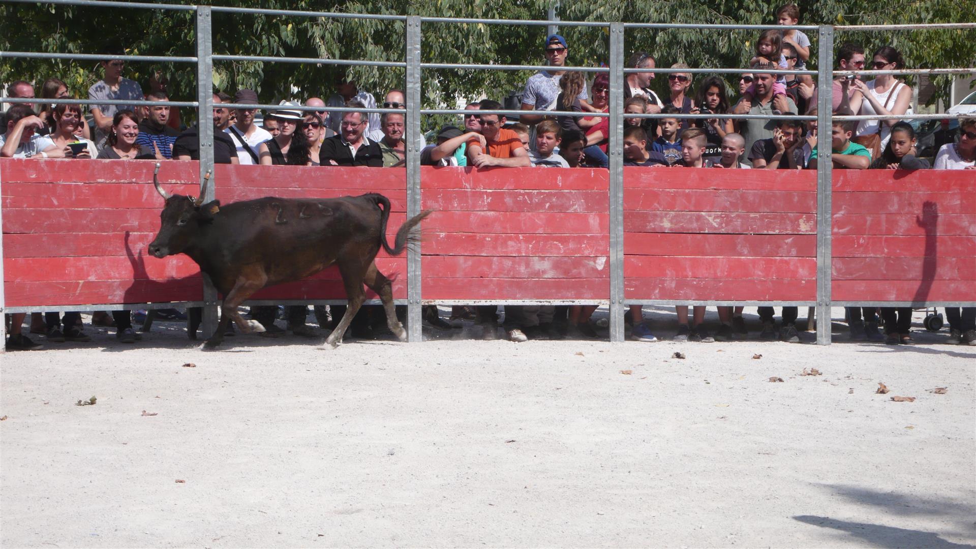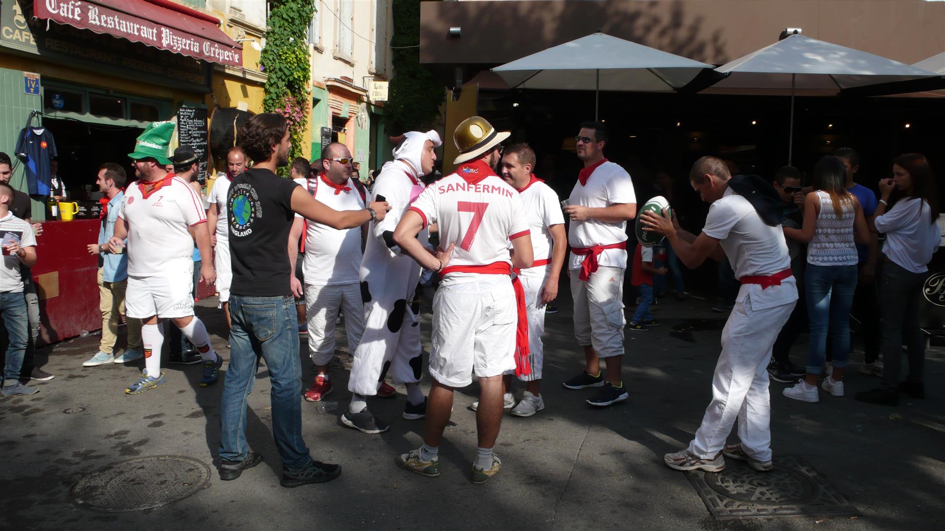 Gegen Abend wurde die Promenade der Stadt abgesperrt und Stiere wurden in LKWs in die Stadt gekarrt. Ähnlich wie beim berühmten Stierrennen von Pamplona hetzten die Tiere die Strasse entlang, verfolgt von Ross und Reiter. Und auf dem Place du Forum wurde gefeiert. Stierkampfanhänger mit ihren Banderas, typisch gekleidet in Weiß-Rot, feierten auf der Straße und vor den Bars zu lauter Musik, Bier und Parolen.