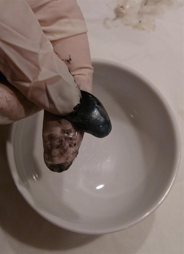 A parte pulisci e spella le seppie facendo attenzione, nello svuotare le sacche, a non rompere le vescichette con l’inchiostro, che metti da parte (Foto 2).