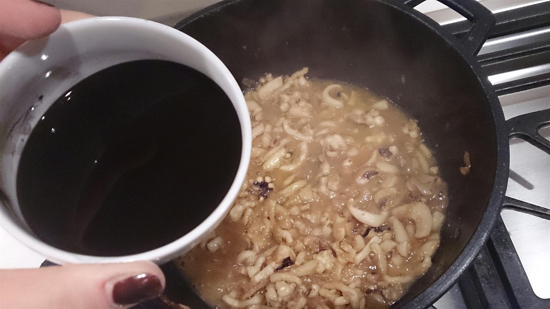 Lavale più volte sotto l’acqua corrente quindi taglia le seppie a striscioline fini ed uniscile al soffritto (Foto 3).