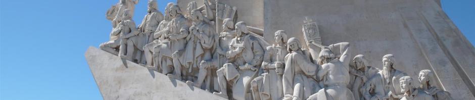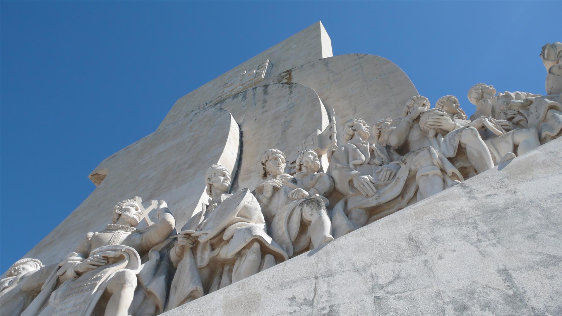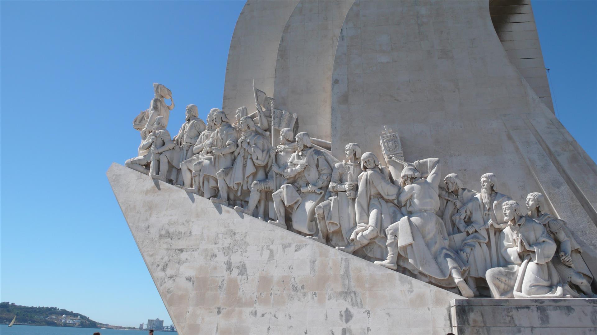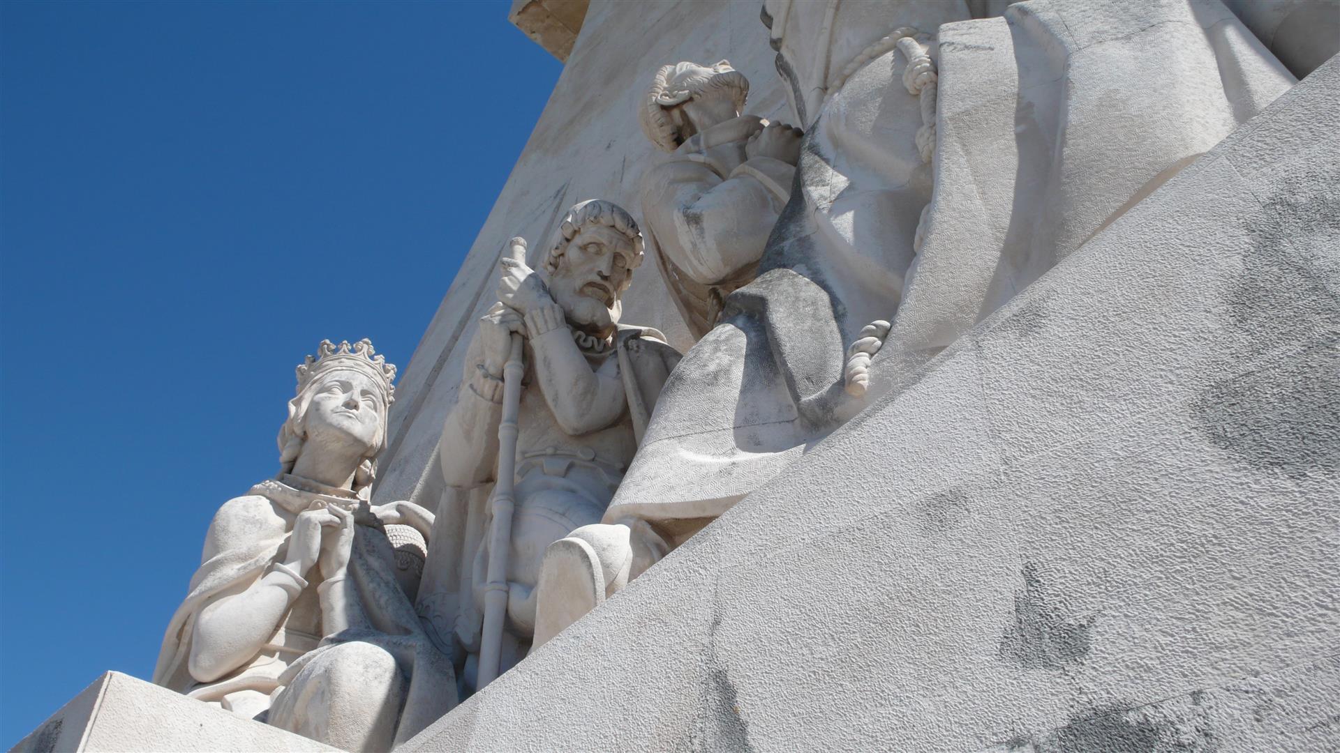 The Monument to the Discoveries represents a three-sailed ship ready to depart, with sculptures of important historical figures such as King Manuel I carrying an armillary sphere, poet Camões holding verses from The Lusiads, Vasco da Gama, Magellan, Cabral, and several other notable Portuguese explorers, crusaders, monks, cartographers, and cosmographers, following Prince Henry the Navigator at the prow holding a small vessel. The only female is queen Felipa of Lancaster, mother of Henry the Navigator, the brain of the discoveries.