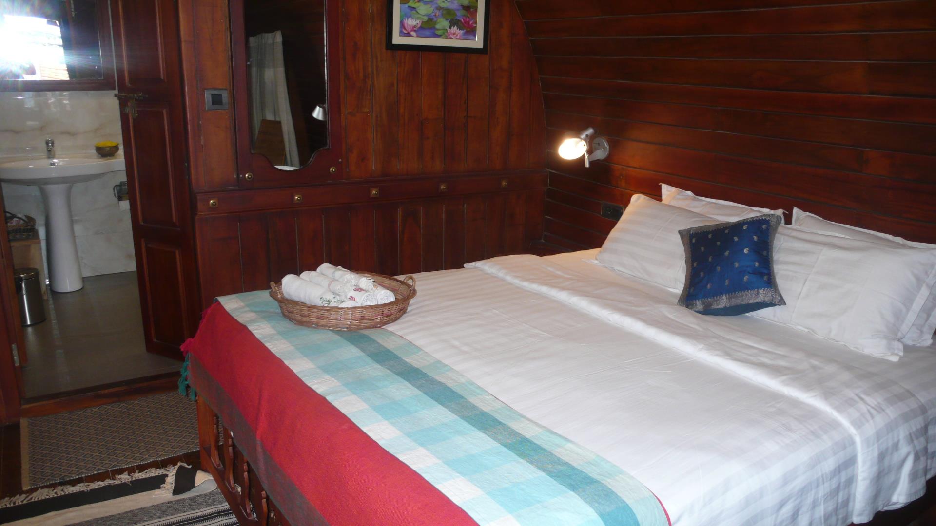 „We cover now a distance of 35 Kilometers“, mentions Captain Anoob. Every guest can choose his own tour. „On a 3 days houseboat trip we go as far as 200 Kilometers in total.“I enjoyed a comfortable bedroom made out of bamboo and wood furniture, as well as a spacious modern bathroom. I saw a couple of houseboats crossing our way. They were big and small. Both. Normally the boats tied together with coir from the coconut palms. They have been the cargo boats carrying tons of materials in the past. The Somatheeram houseboats got only modified and altered the original structure.