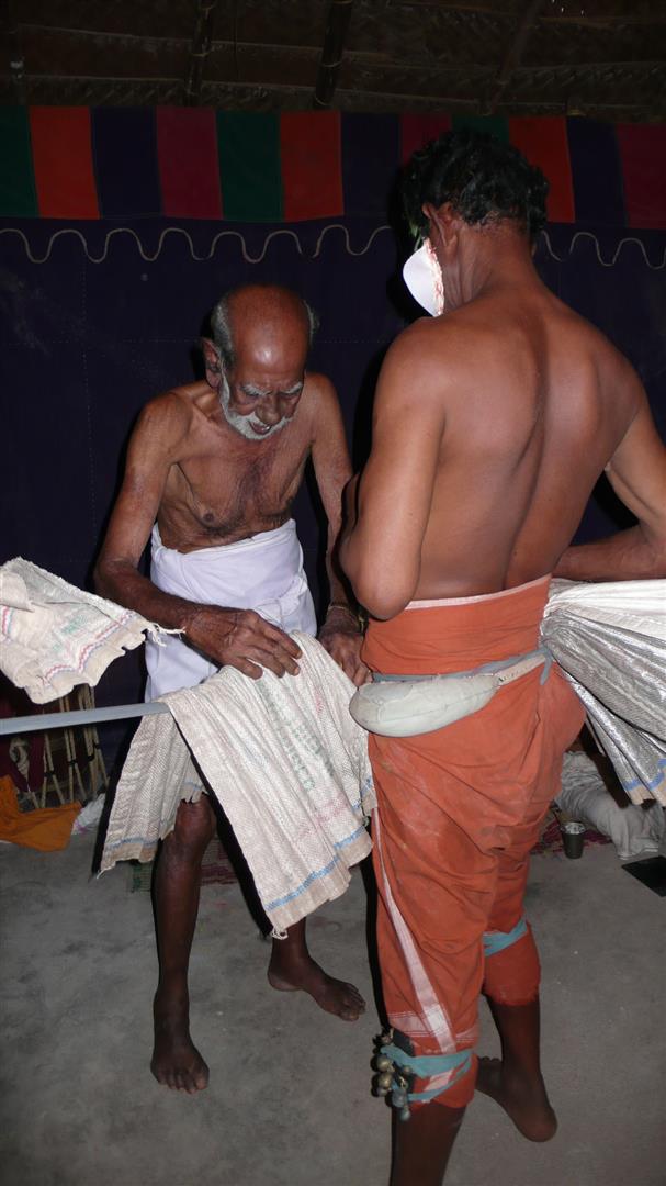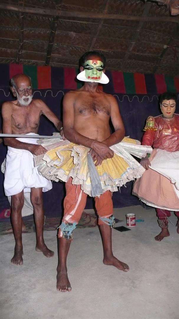 The makeup is very elaborate. It is so elaborate that it is more like a mask than makeup in the usual sense. The materials that comprise the makeup is all locally available. The white is made from rice flour; the red is made from Vermilion (a red earth such as cinnabar). The black is made from soot. The colours are not merely decoration, but are also a means of portraying characters. For instance, red on the feet is used to symbolise evil character and evil intent. I was there some hours before the show and could look at the make-up procedure. And I got to know the artists: Maneesh, Manohar und Vinayan.