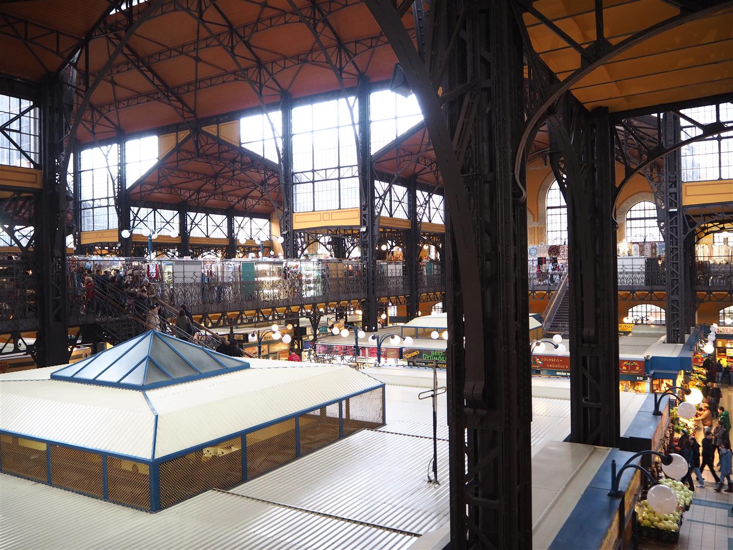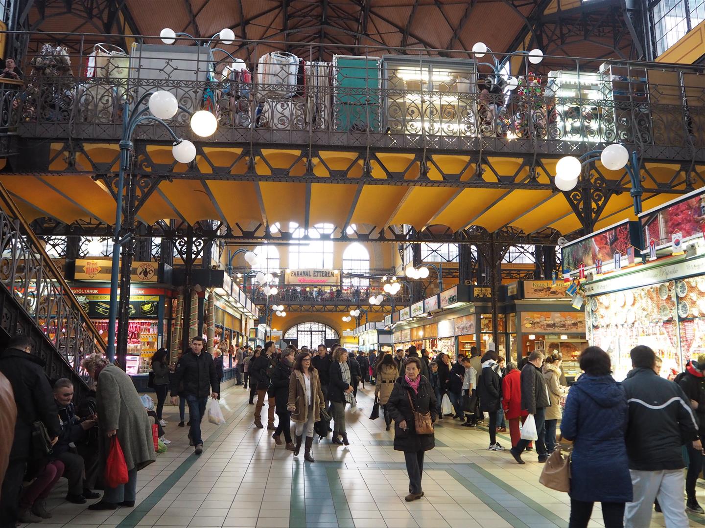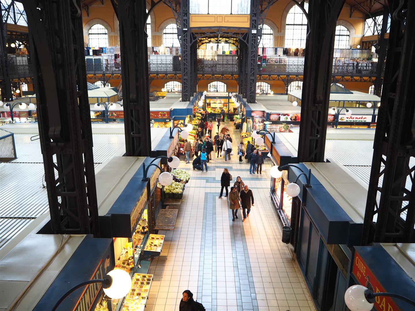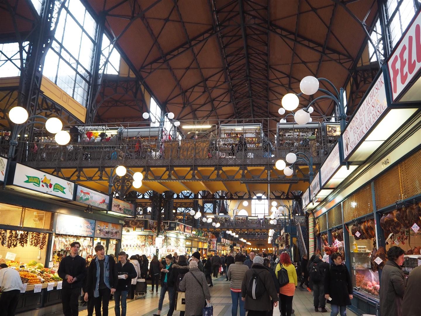 Die Große Markthalle (Nagy Vásárcsarnok) ist der wichtigste Markt von Budapest. Marktstände verteilen sich auf zwei Etagen. Doch die Geschäfte spielen sich hauptsächlich im Erdgeschoss ab. Knoblauchgirlanden, Paprika, frische Früchte, Gemüse, Würste, Käse – hier finden wir alles, was das Schlemmerherz begehrt. In der oberen Etage gibt es Touristensouvenirs, viele davon sind sehr kitschig.