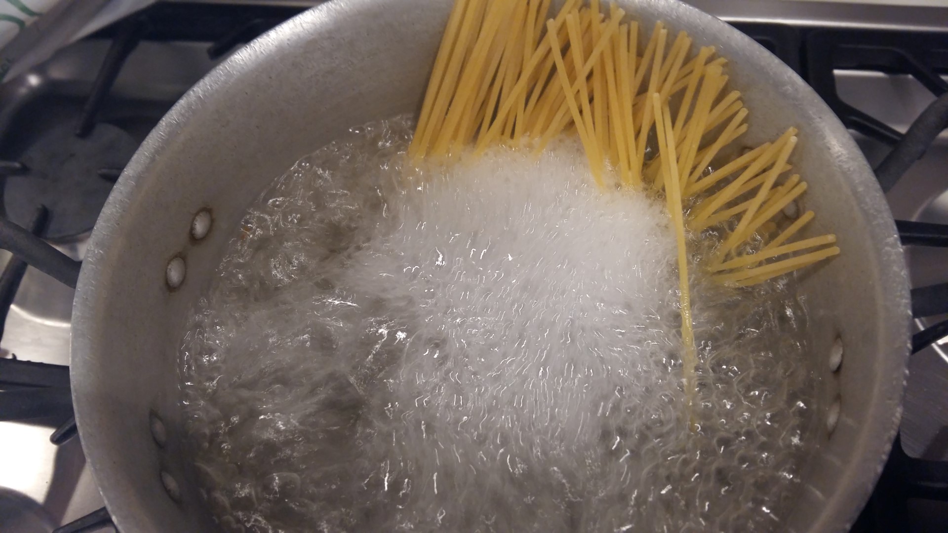 Cuocere gli spaghetti in abbondante acqua salata e scolarli molto al dente. (Foto 3)
