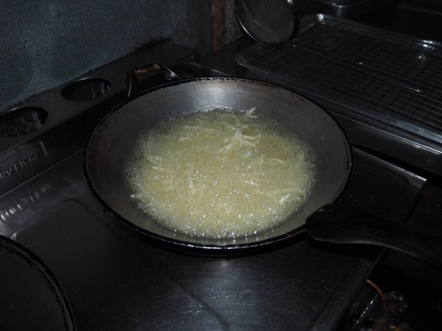 5. Diese Streifen dann ins heiße Öl geben, brutzeln lassen