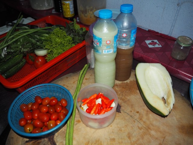 Zutaten: Palmöl, 1 grüne Papaya, 2 Eiswürfel, Tempura (Mehl), Limonensaft, Tamarindensaft, 1 Karotte, Blaukraut, 1 Knoblauchzehe, frisches Chili, Palmzucker (Masse), Erdnüsse, Fischsosse. Das Meiste bekommt Ihr in den Asia Shops!