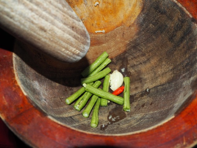 7. in Mörser 1 Knoblauchzehe, frisches Chili und zerkleinerte Bohnen geben und diese stampfen