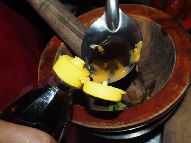 8. Jeweils einen Esslöffel Limonensaft und Tamarindensaft sowie einen halben Esslöffel Palmenzucker (zähe Masse, sieht aus wie Erdnussbutter), einen Spritzer Fischsosse sowie zerkleinerte Erdnüsse hinzugeben. Außerdem ein paar Streifen Karotten und Blaukraut.