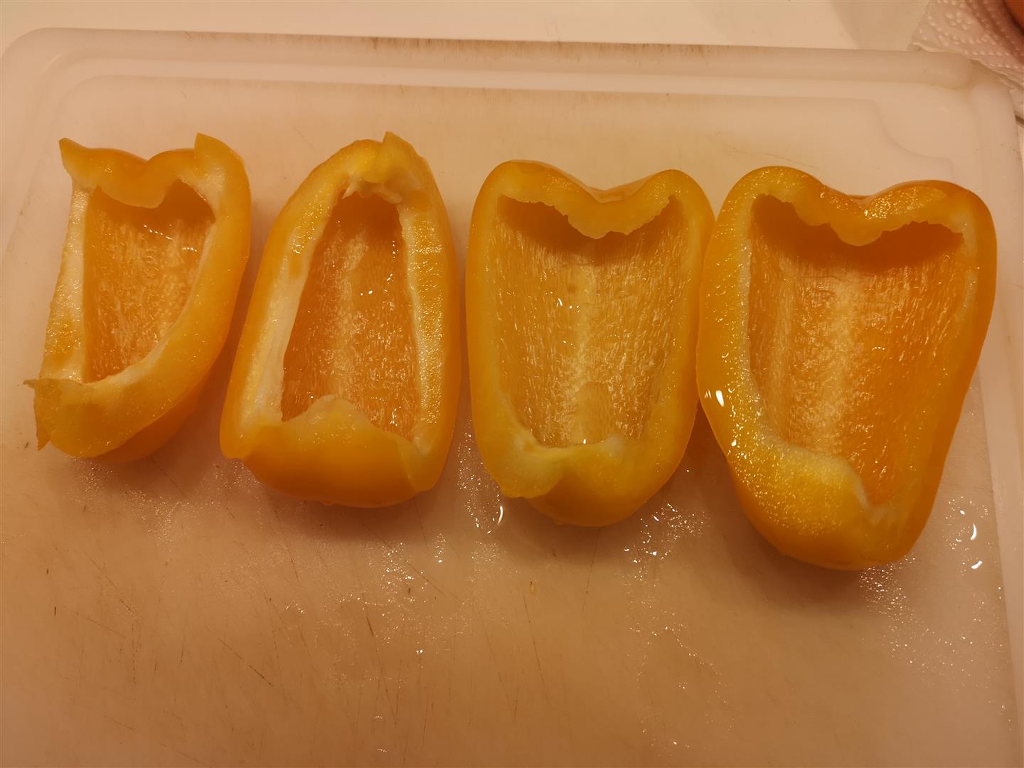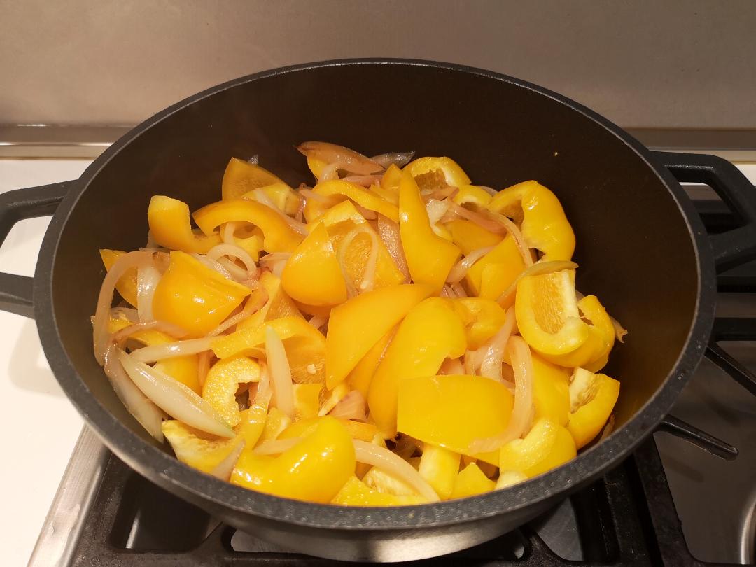 Per preparare la peperonata lava asciuga tutta la verdura. Affetta la cipolla abbastanza grossolanamente e versala in un tegame capiente assieme all’olio ed allo spicchio di aglio pulito ma intero (Foto 1).