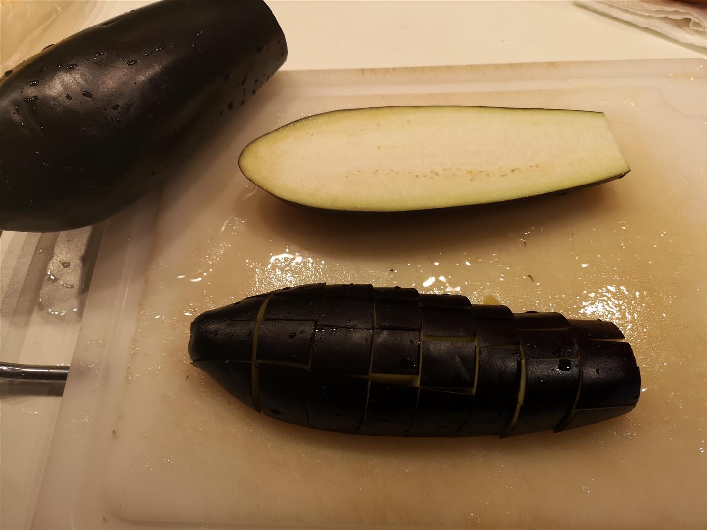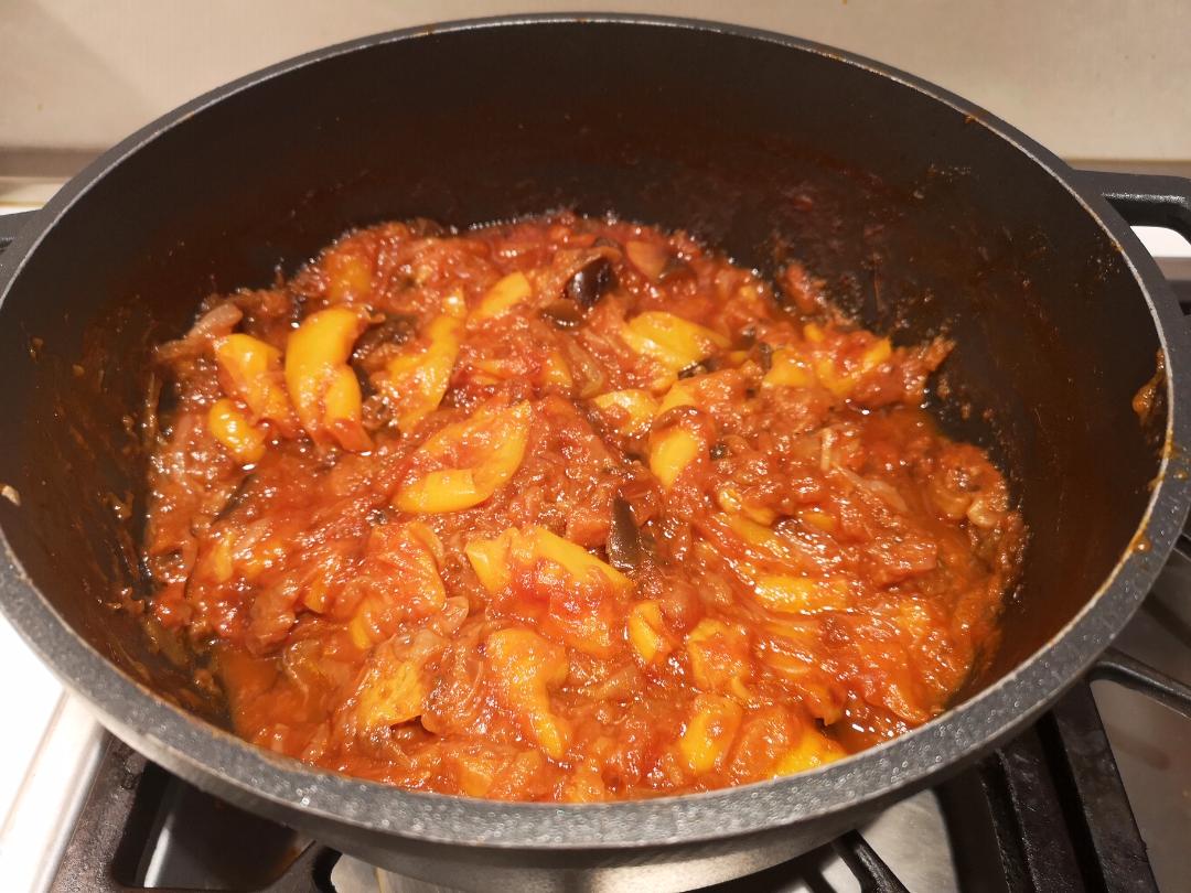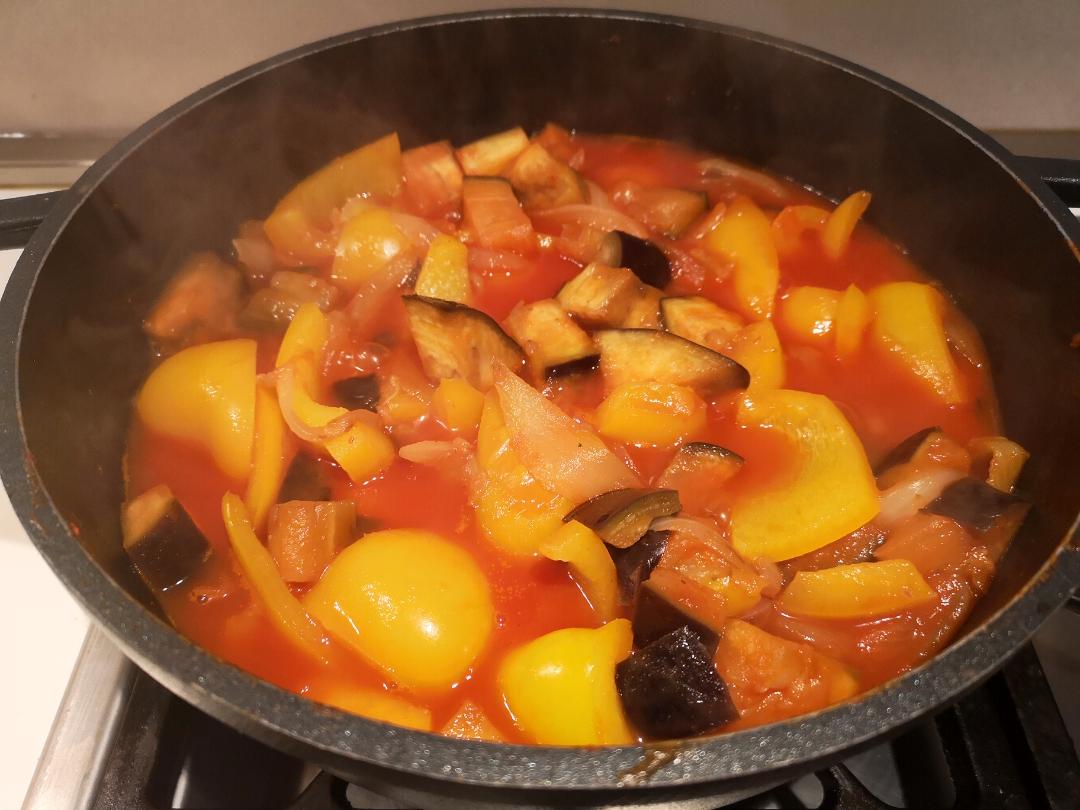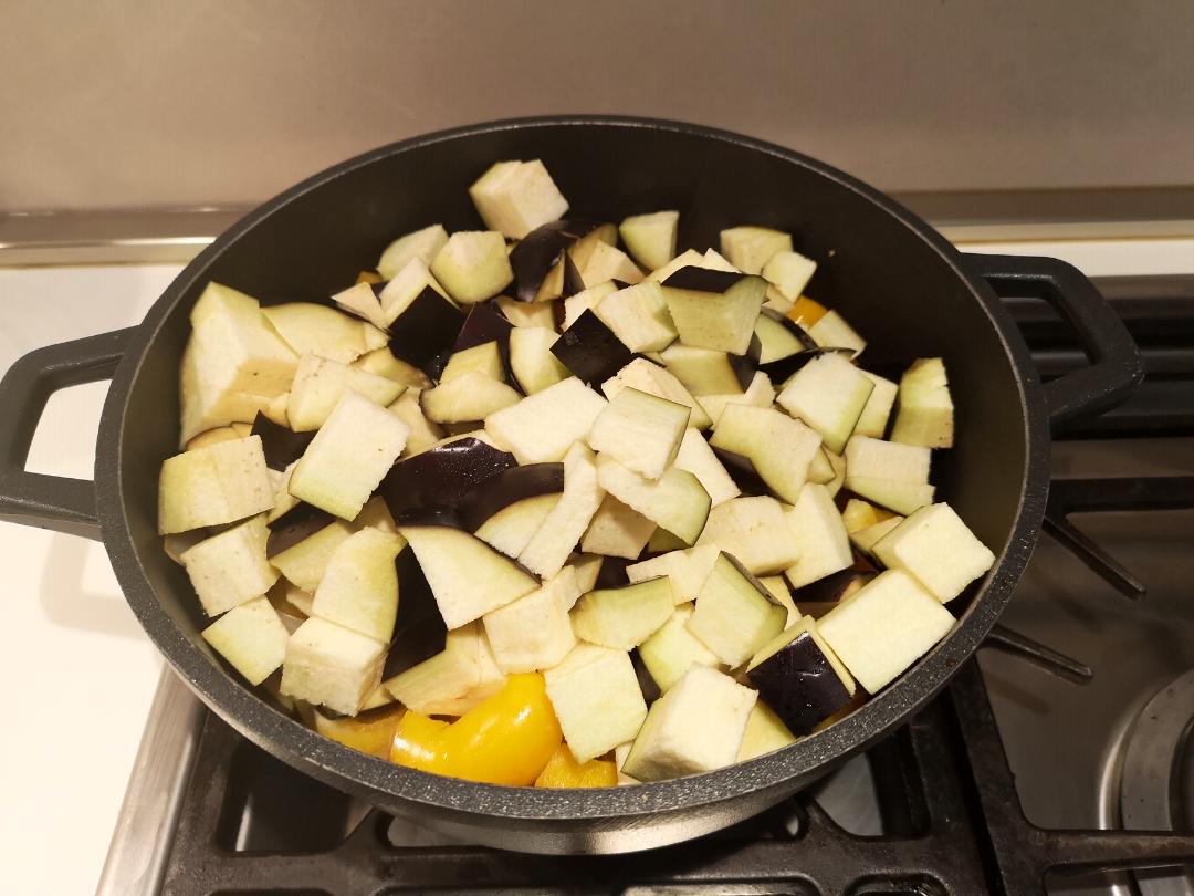 Fai stufare le cipolle a fuoco medio per circa 15 minuti, nel frattempo fai sbollentare i pomodori per qualche secondo in acqua bollente in modo da poterli pelare facilmente. Taglia a pezzi sempre grossolani tutte le verdure: i peperoni dopo averli puliti dai semi e filamenti bianchi, le melanzane ed i pomodori (Foto 2 e 3).