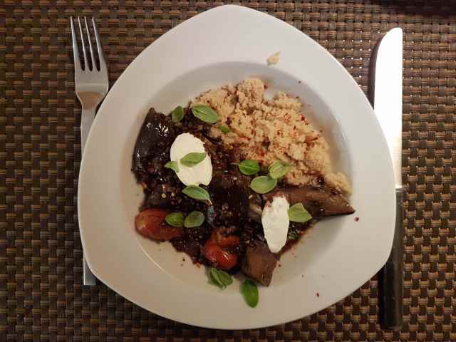 Die Auberginen werden weich, die Linsen sind noch hart. Statt 40 Minuten brauchen sie nur 20 Minuten. Der Mann guckt skeptisch. Okay, war ein Versuch. Angerichtet mit Couscous, Crème fraiche und Basilikumblättern sieht’s gleich viel besser aus. Und siehe da, es schmeckt auch viel besser als es aussieht. Der Couscous nimmt die würzige Soße auf, Kräuter und Gemüse sind köstlich. „Super, weiter so“, sagt der Mann und isst.