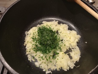 Una volta che la cipolla sarà imbiondita, ci vorranno circa 10 minuti di cottura a fuoco basso, aggiungete la pancetta tritata (facoltativa) ed il prezzemolo tritato. (Foto 5)