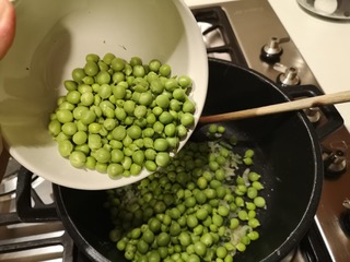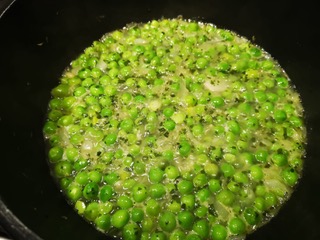 Fate insaporire per un paio di minuti quindi aggiungete i piselli ed un cucchiaio di olio. (Foto 6)